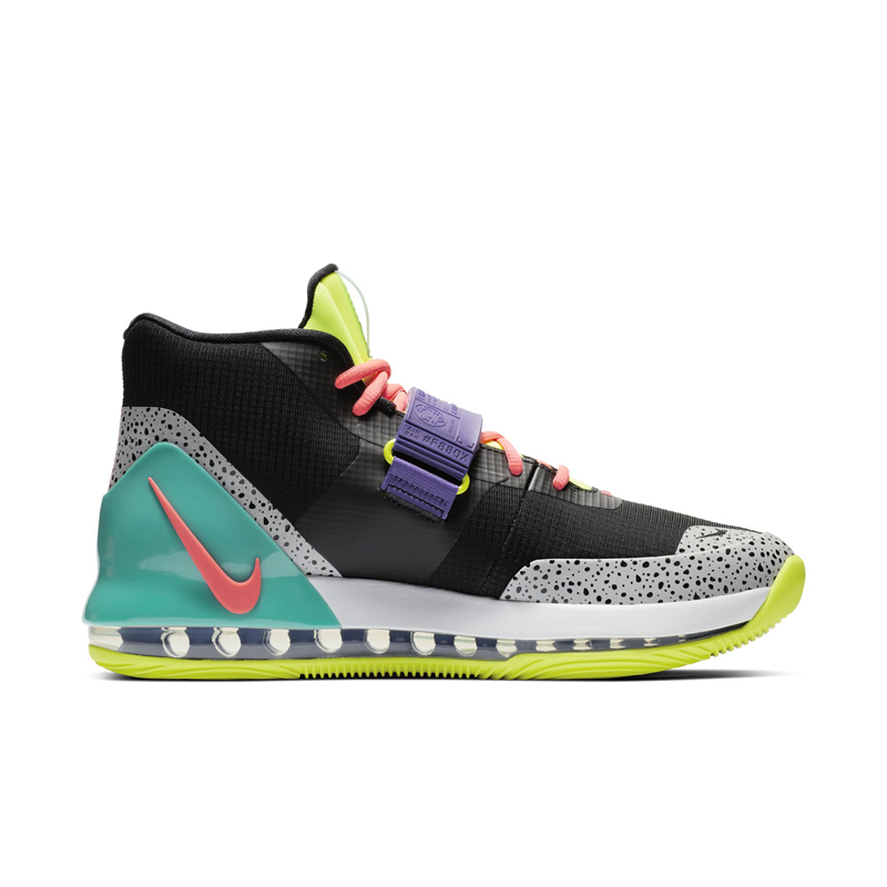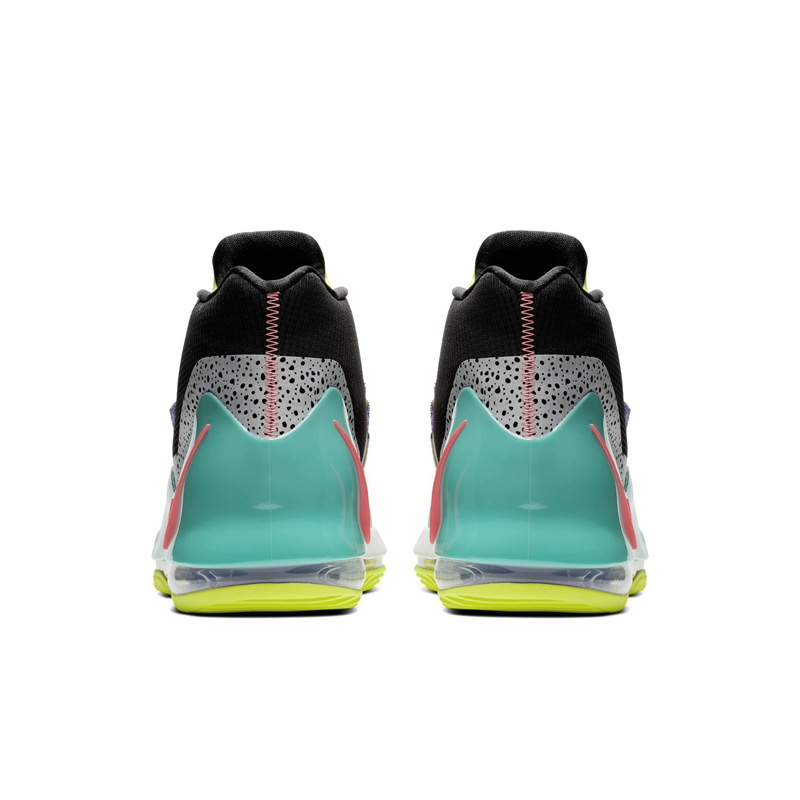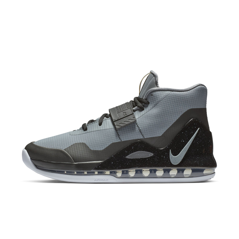 鞋款为高帮设计,鞋面使用机能网布材质搭配热熔补强,用料相当前卫。鞋身中部加入橡胶魔术贴绑带,后跟使用罕见的超大 TPU 环抱,提供强悍的保护性。中底搭载近几年已经不常见的 Air Max 360 气垫,更适合大体重球员。