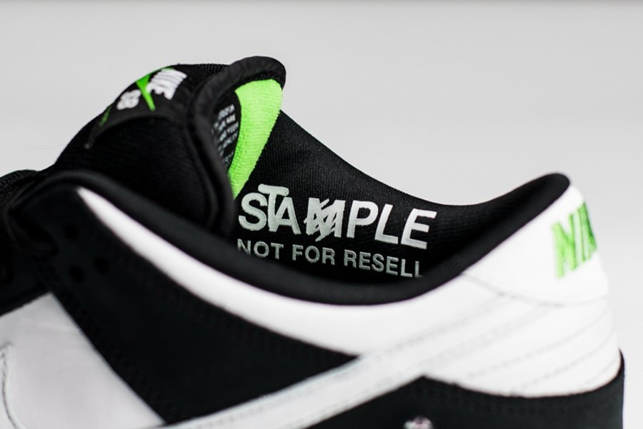 在熊猫鸽子的内衬上,依然保留 “SAMPLE” 的文字说明,并巧妙地修改成 “STAPLE”,讲述了这款配色曲折的 “身世”。