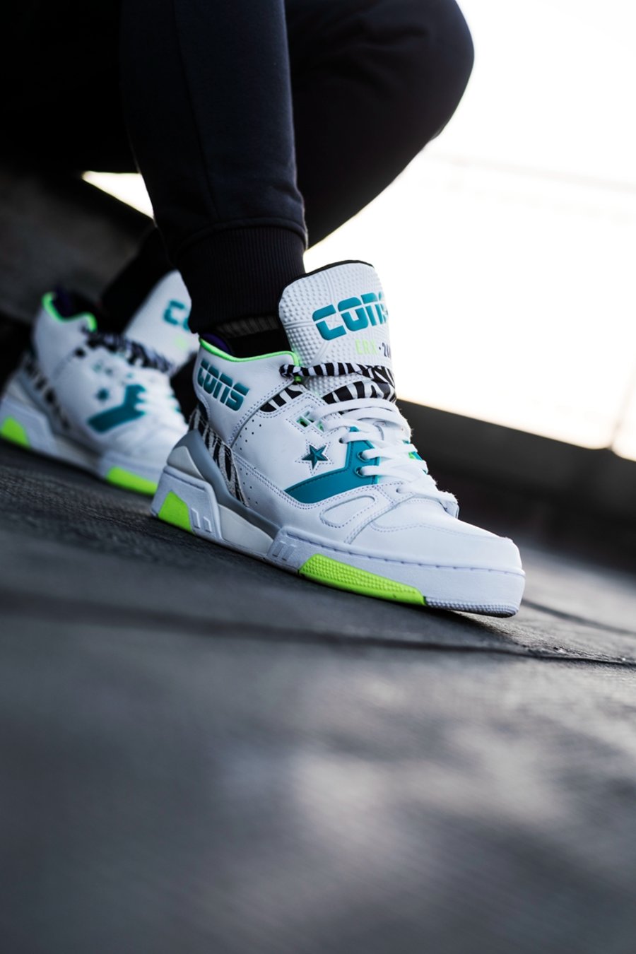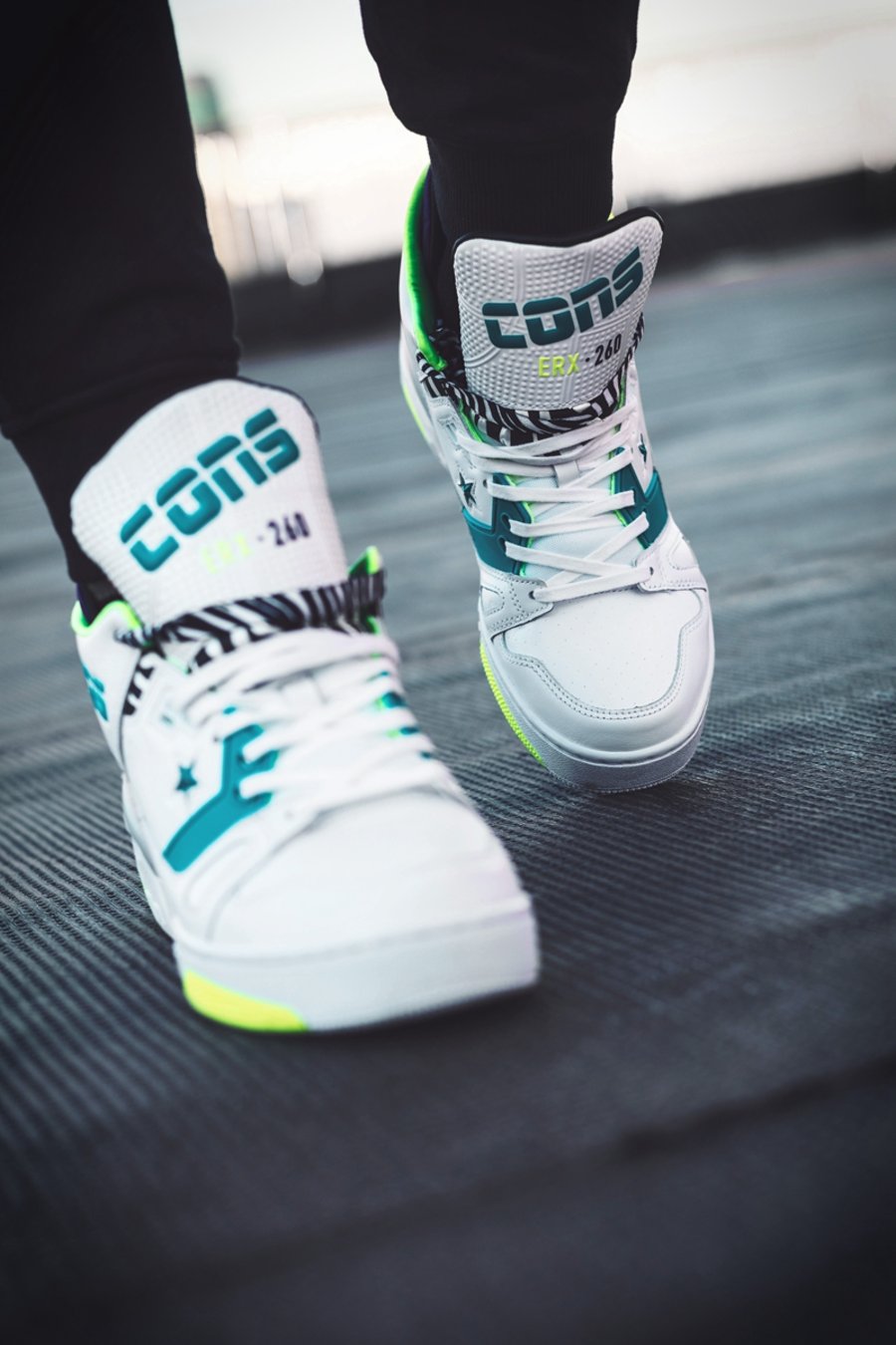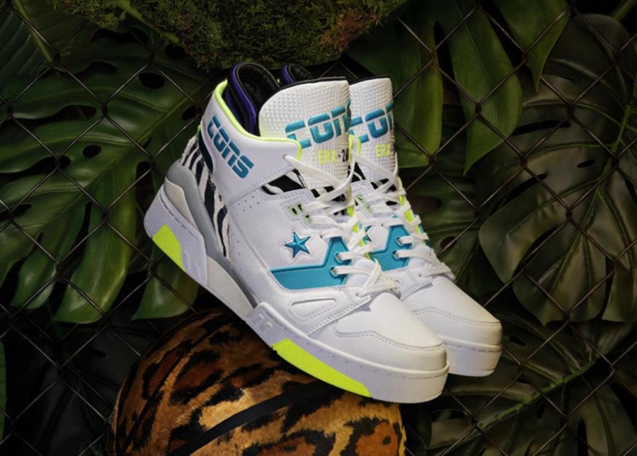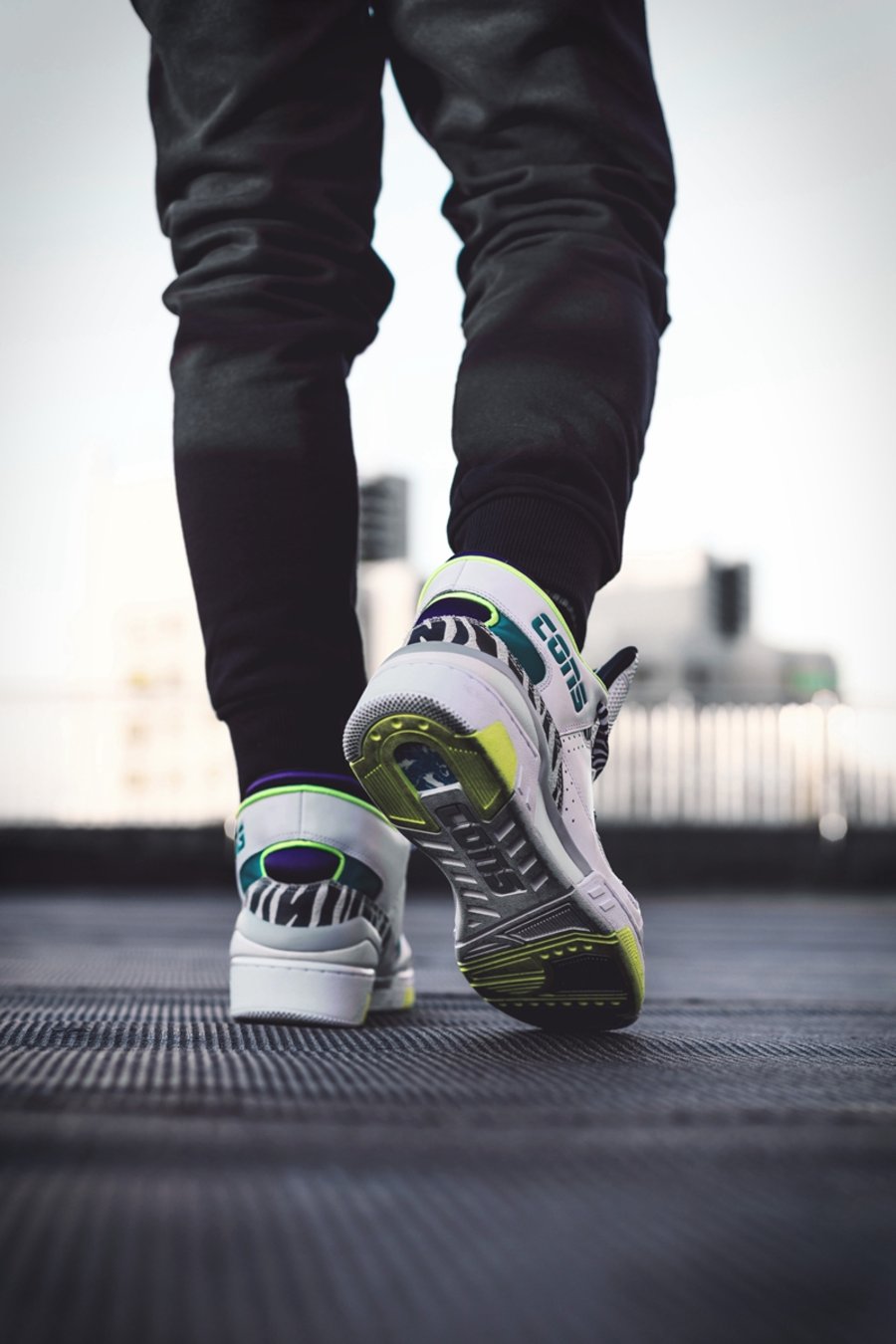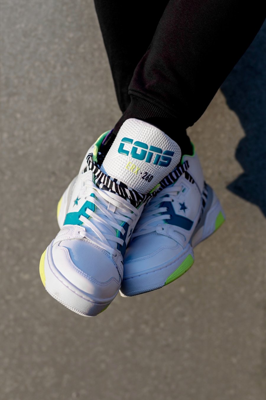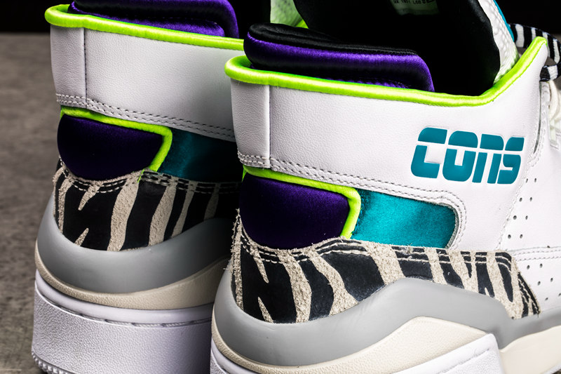 夸张的复古波点纹饰大鞋舌,天青色 CONS Logo 搭配荧光绿 Erx 字样,绸面斑马纹又恰到好处的点缀着简洁的鞋面,虽然时代感极强,但仍凸显着不羁的气质。