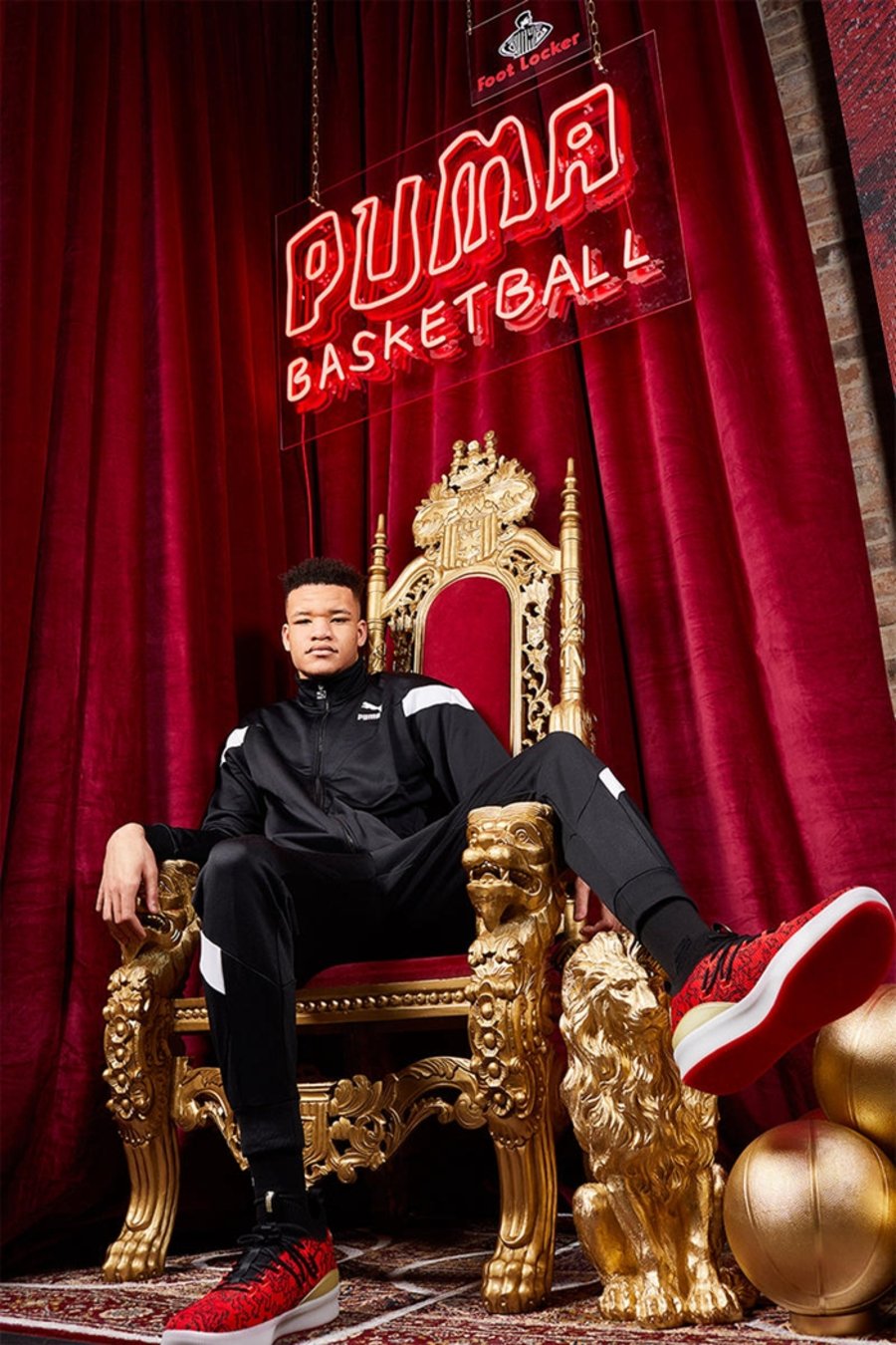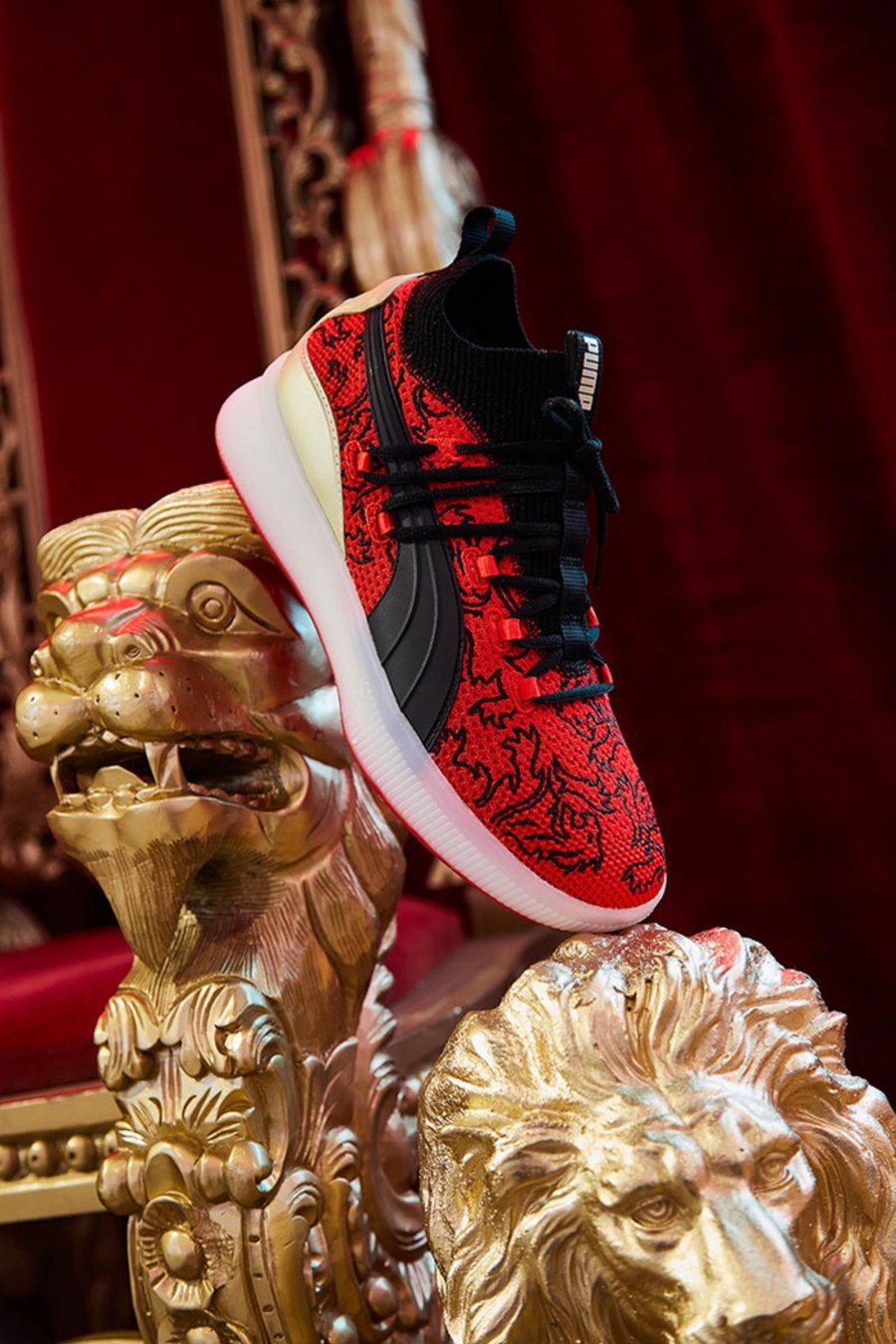 整体选用红、黑、金三种颜色呈现,鞋面布满黑色狮王图案,彰显其 “London Calling” 独特配色主题。而后跟处的金色支撑片,又让整双鞋更富有视觉冲击力。
