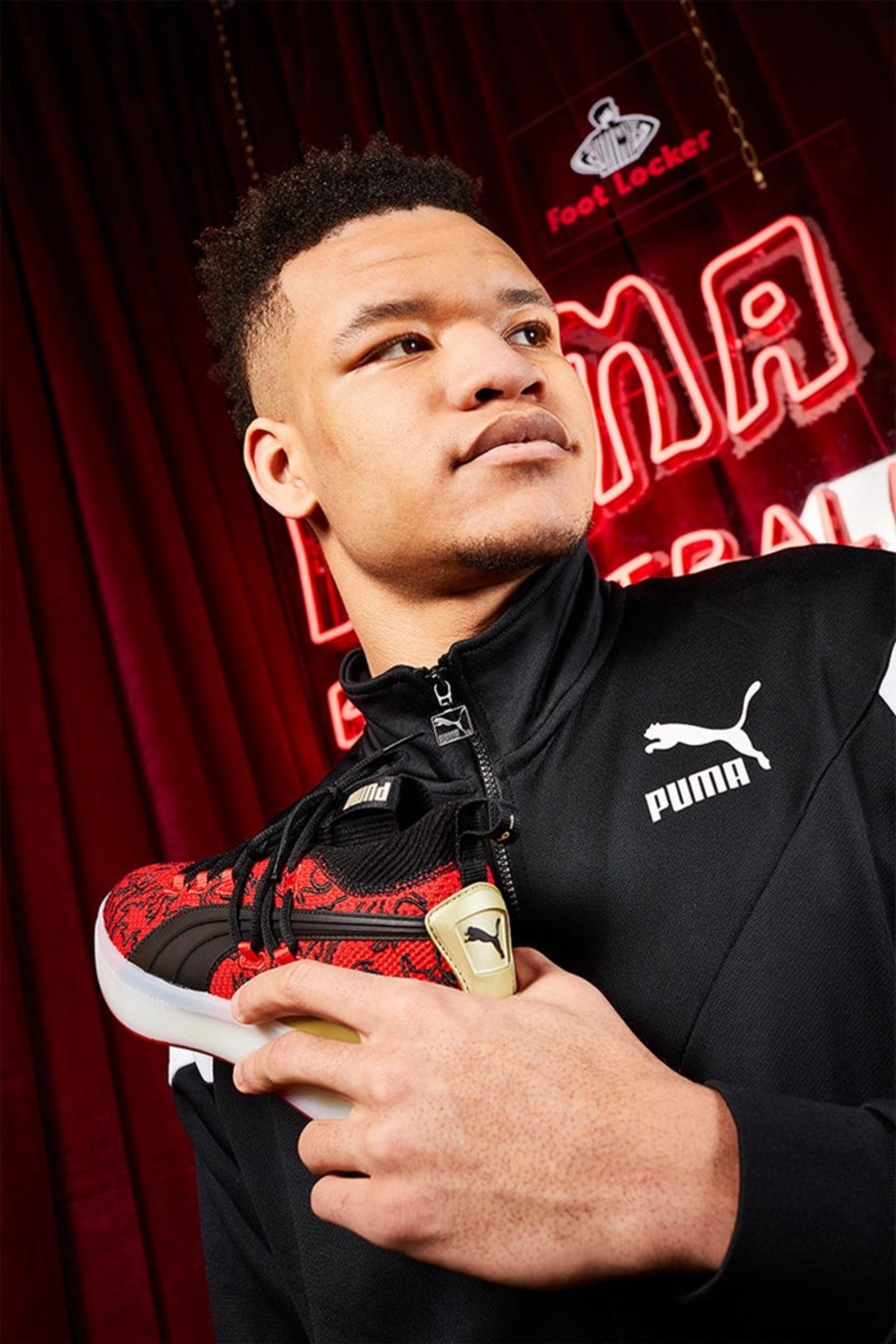 不知你有没有注意,在今日华盛顿奇才对阵纽约尼克斯的比赛上,Kevin Knox 就穿着该款配色的 Puma Clyde Court。