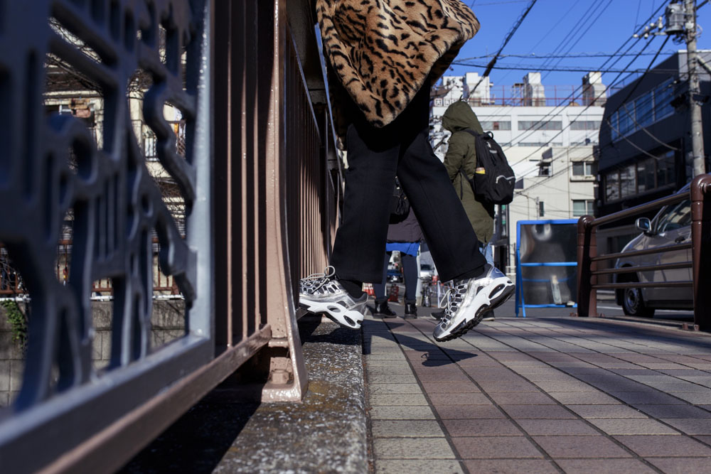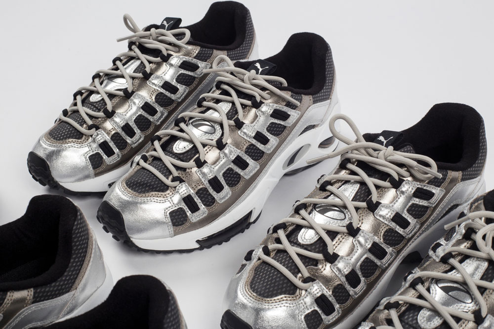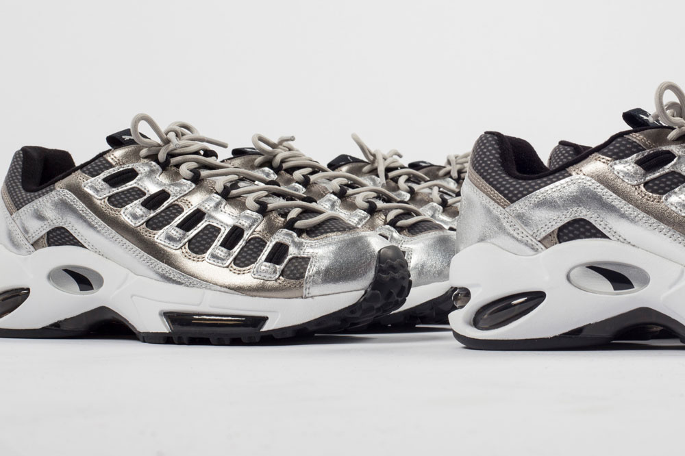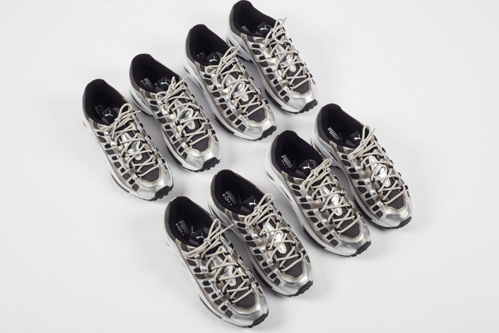 此次合作以 “未来主义” 与 “非比寻常” 的设计理念打造,将网眼材质结合 PU 覆层皮革打造鞋面,并采用富有彩虹般变幻光泽的银色金属色为主调。