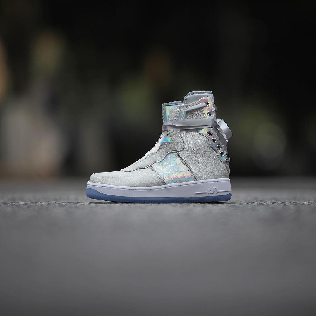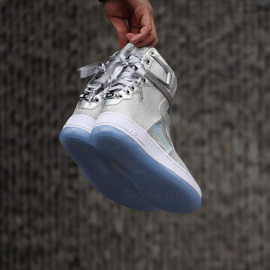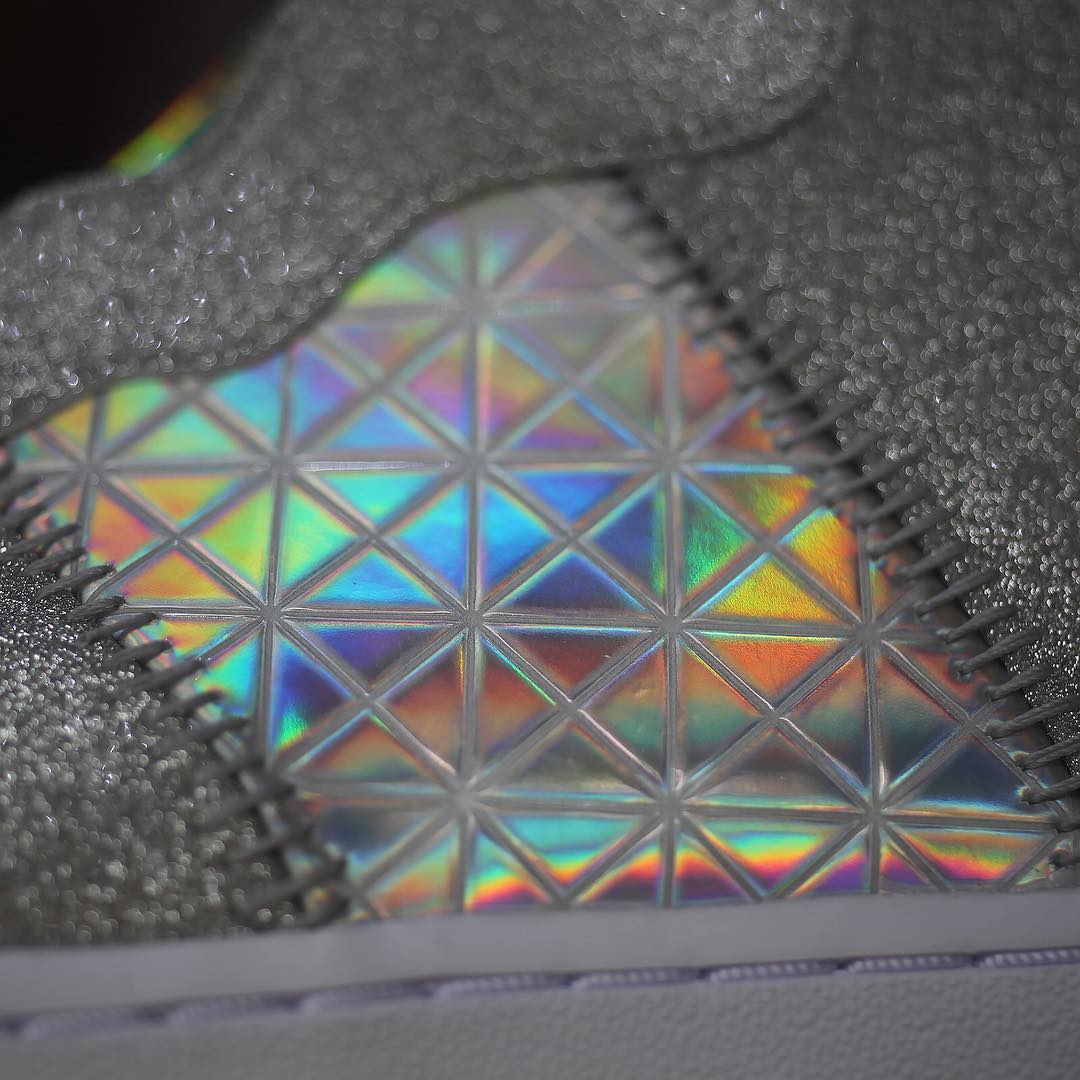 整双鞋都银色为主调,大面积的银色搭配多彩的全息面料,拱手图案点缀在鞋帮处,鞋带使用绸缎材质,最后搭配白色中底和水晶外底,相信很少有女生能拒绝它的诱惑,即便是男生都会有不少被种草。