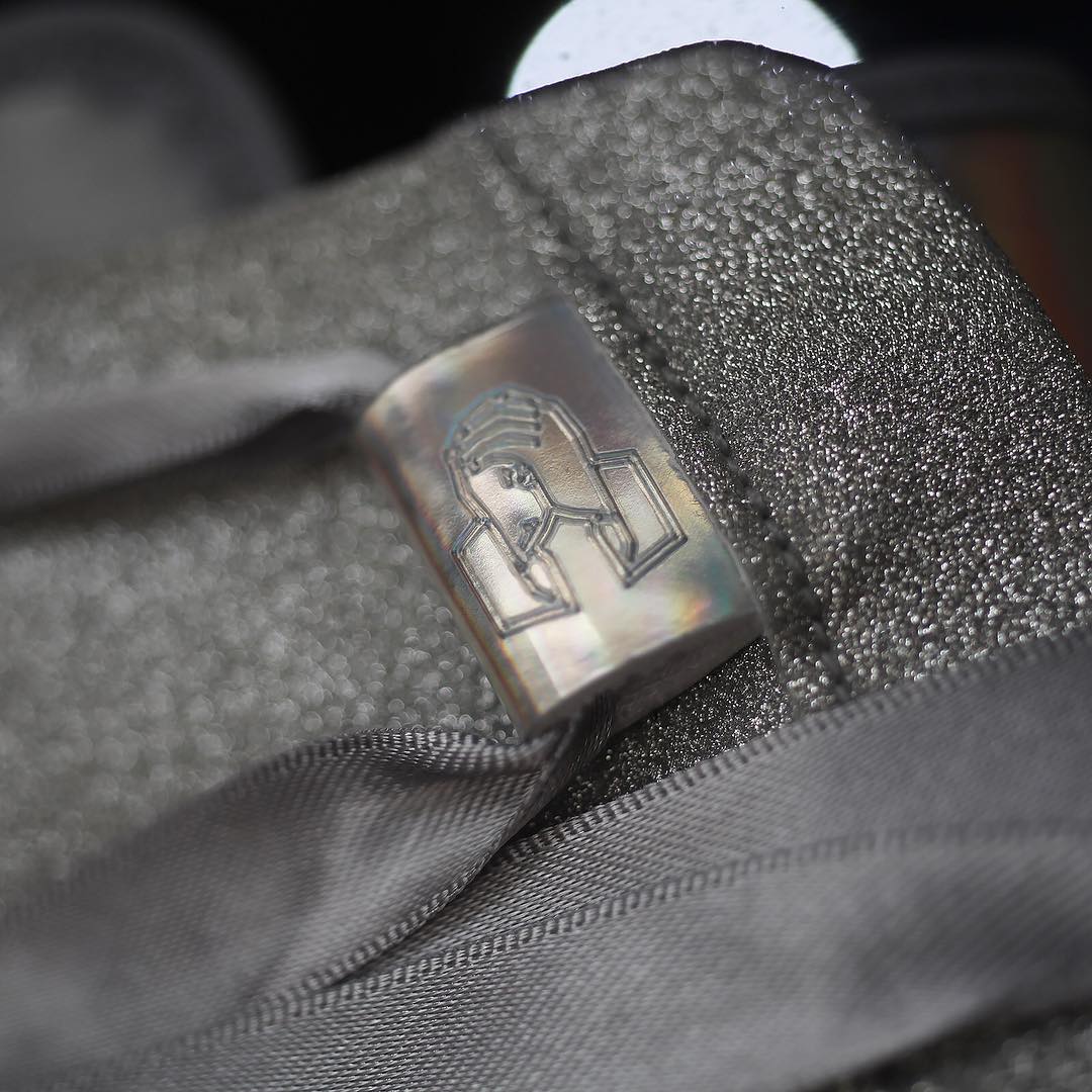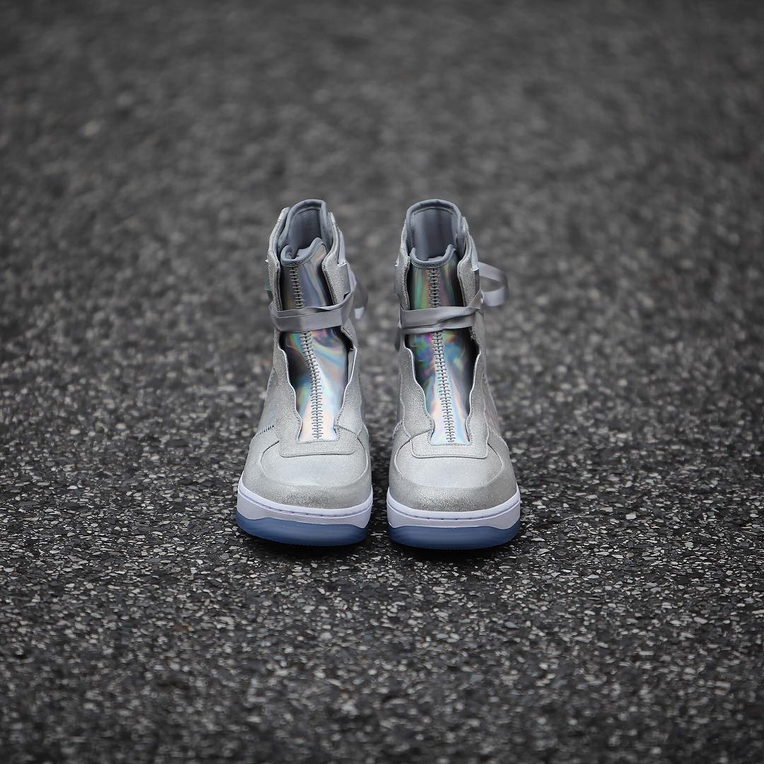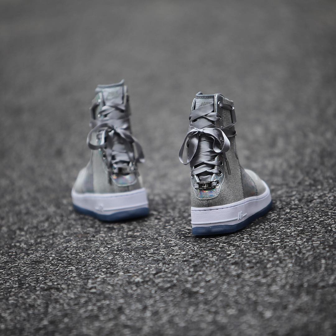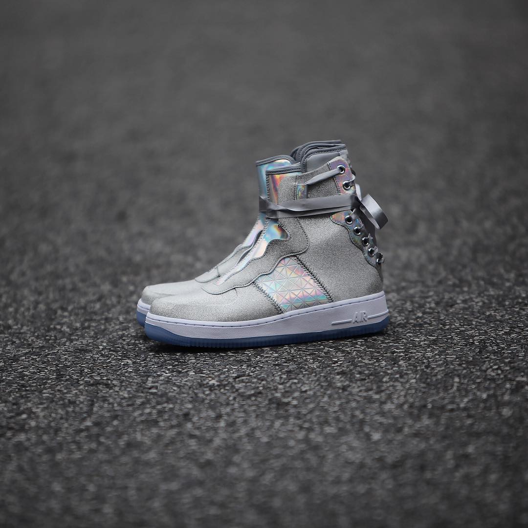 整双鞋都银色为主调,大面积的银色搭配多彩的全息面料,拱手图案点缀在鞋帮处,鞋带使用绸缎材质,最后搭配白色中底和水晶外底,相信很少有女生能拒绝它的诱惑,即便是男生都会有不少被种草。