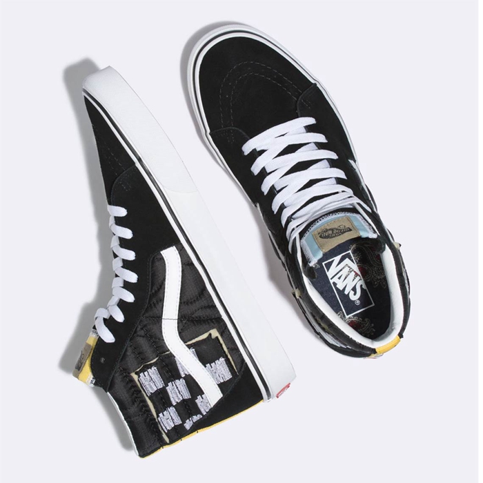 以经典的 Sk8-Hi 鞋型为蓝本,区别于普通鞋款,加入了最新混合缝纫概念。鞋帮处除了独特的车线纹理,还巧妙的加上了块棋盘格样式的 “补丁”,周围露出内里海绵填充,更具复古街头韵味。而鞋舌处的车线设计,也散发出浓浓的解构气息。