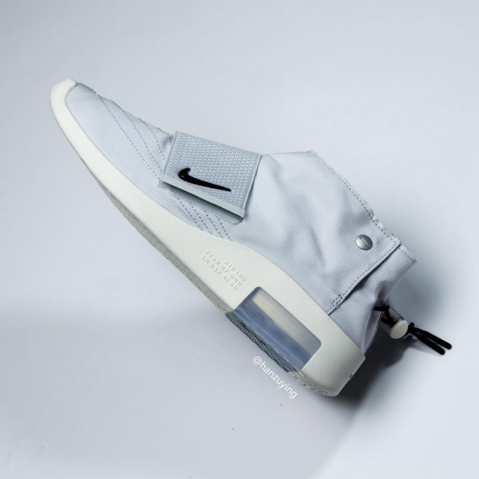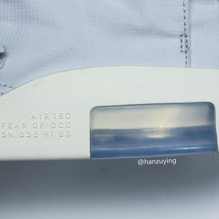 从中底气垫开窗处可以发现,其外层选用 Air max 缓震科技,而对内层缓震留下了伏笔。气垫前刻有 Air 180 和 Fear of God 字样,彰显其独特的联名身份。同时在鞋跟中底部位,用 Nike Air 替代了 Fear of God 字样,无论在整体设计与细节把控上都诚意满满。