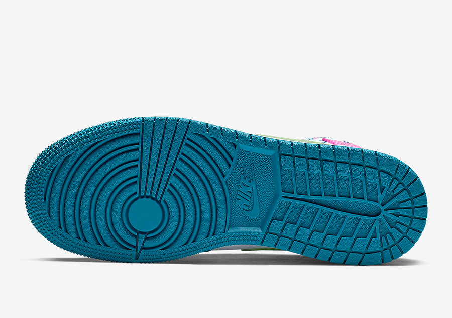 这款配色以白色和青色为底色,鞋帮及后跟的帆布材质之上装饰着极具南海岸风格的青粉泼墨,亮粉色飞翼 Logo 点缀。