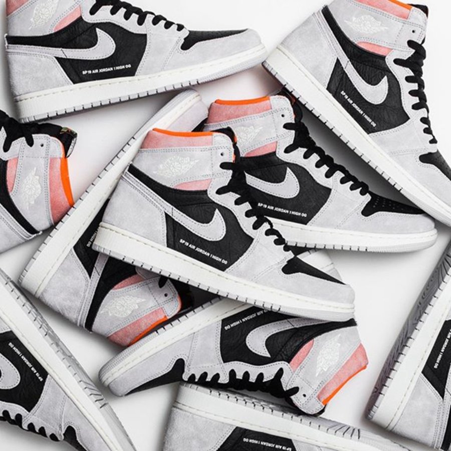 鞋面选用翻毛皮加皮革材质,极具质感。另外,在 Swoosh Logo 下印有 “SP 19 AIR JORDAN 1 HIGH OG” 字样,彰显其独特身份。