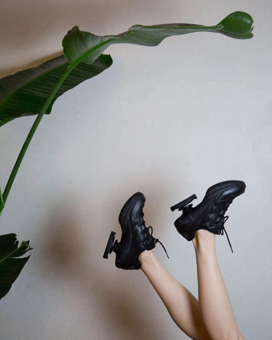 整双鞋设计的非常前卫,让人耳目一新。鞋面采用织物和皮革呈现,在保证包裹感的同时,提供更好的透气性。前侧中底高高耸起,浑然一副高跟鞋的样貌。