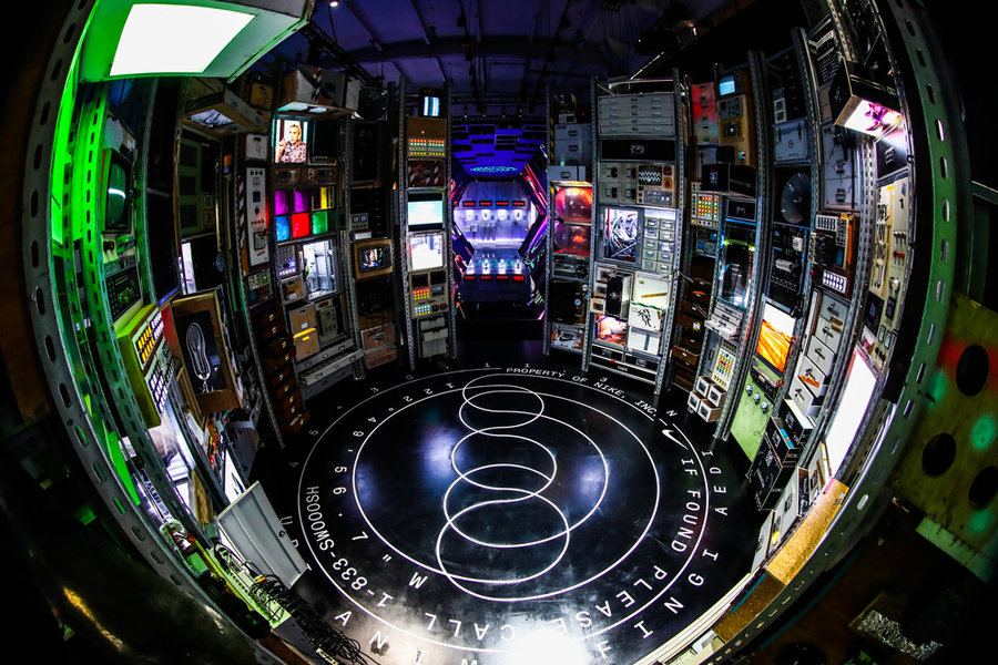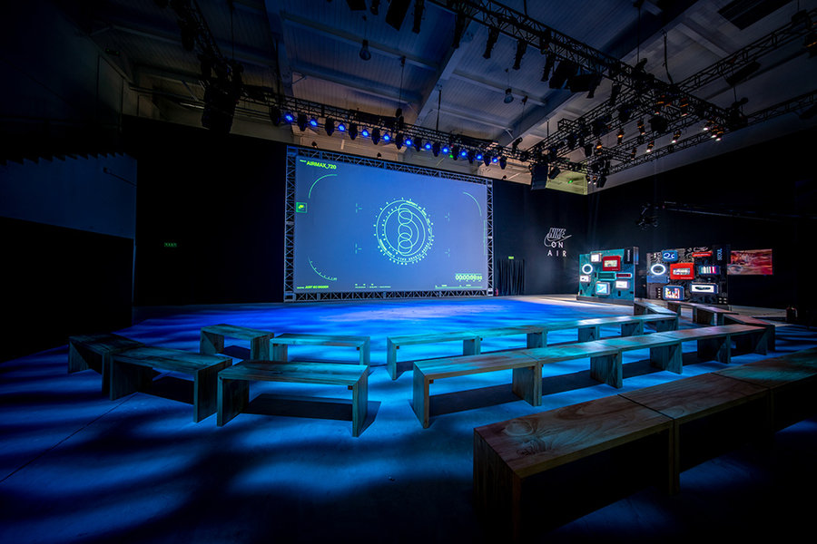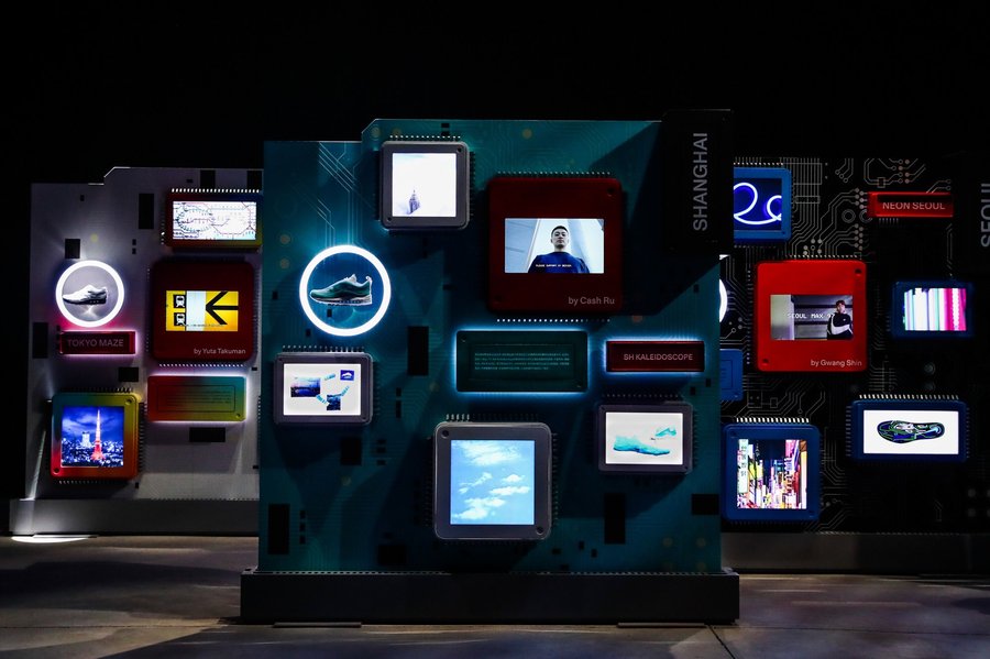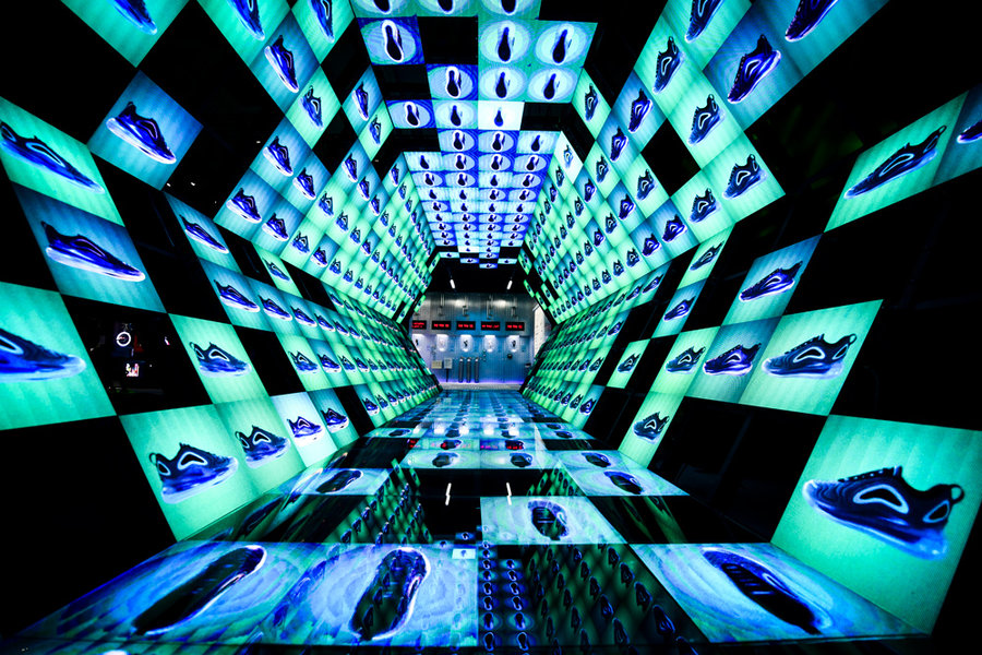 再往前走就会到达一条铺满大量屏幕的通道,直接这些屏幕以此点亮,小编才看出这是一条 Air Max 720 的时间隧道。