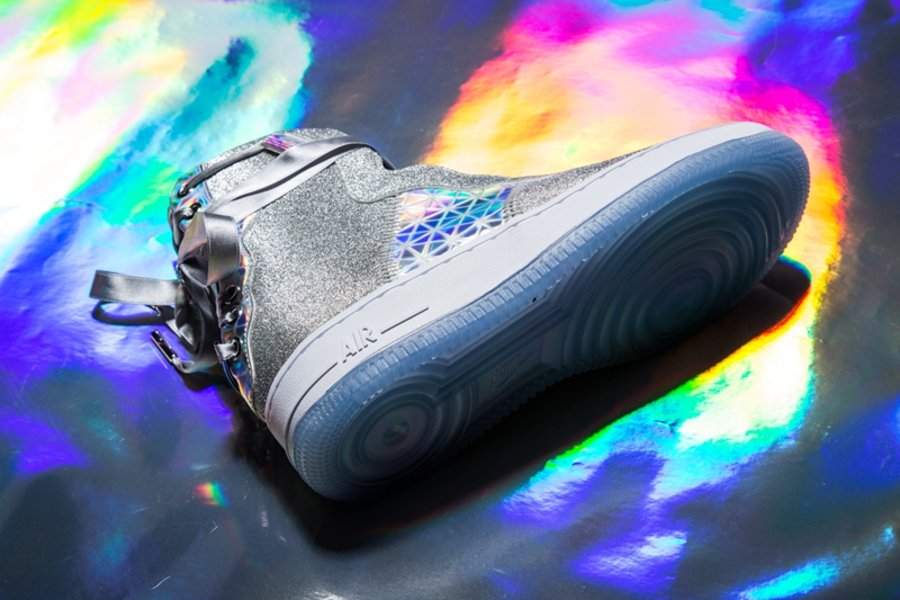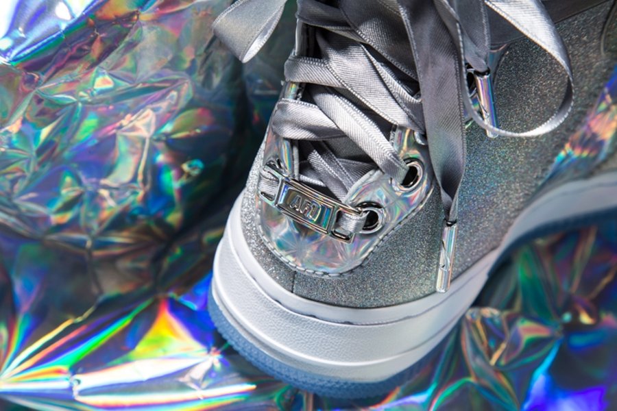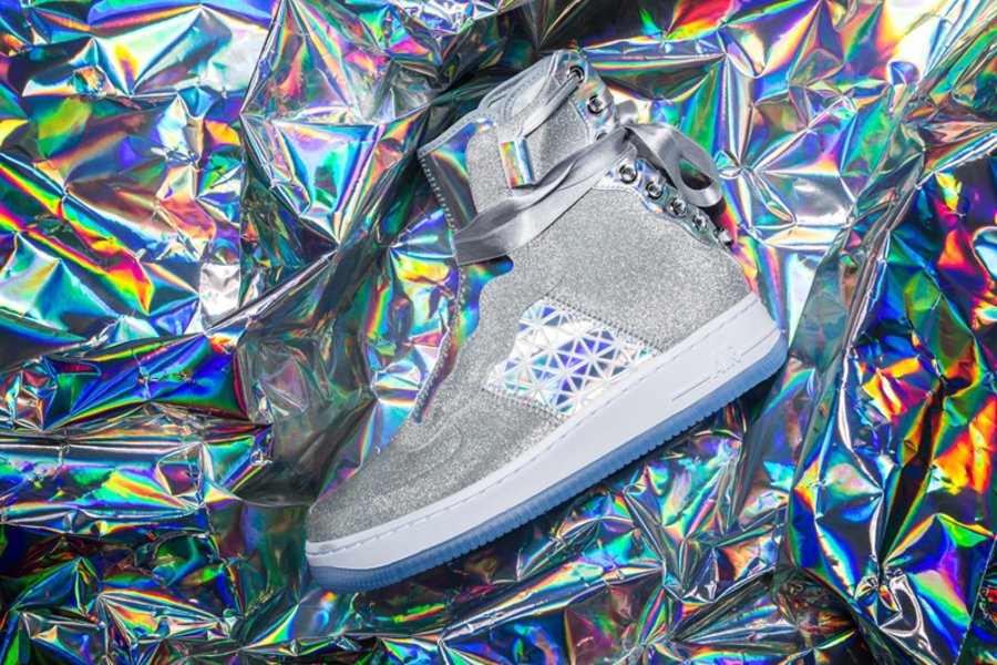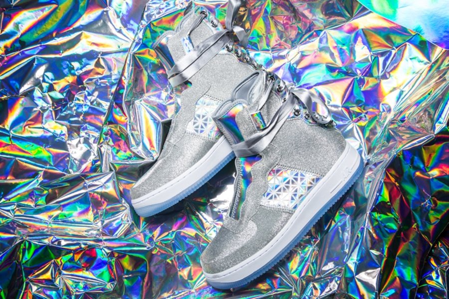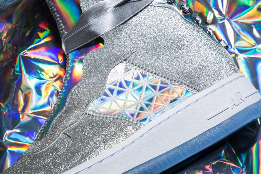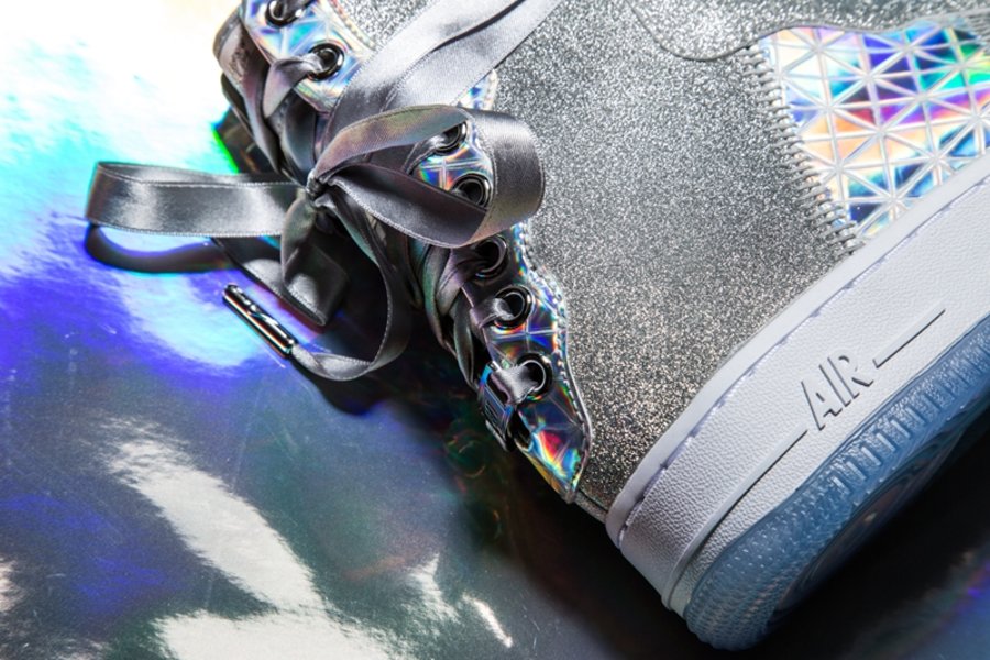 选用全新造型的女性鞋款 Nike Air Force 1 REBEL 为蓝本,辅以银色为主调。搭配百家衣装扮的镭射全息材质,炫丽十足!