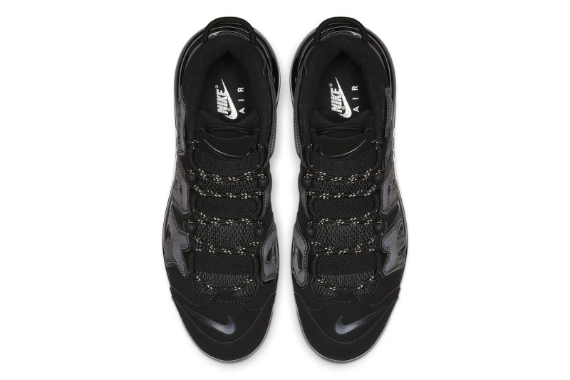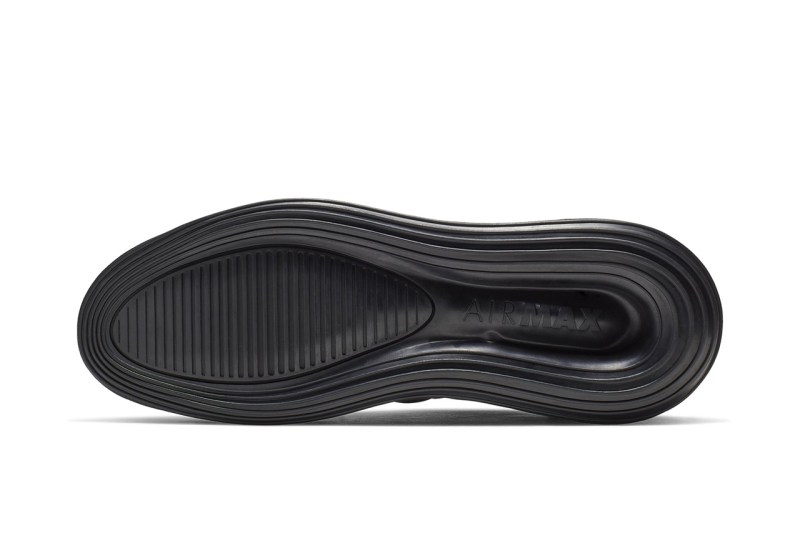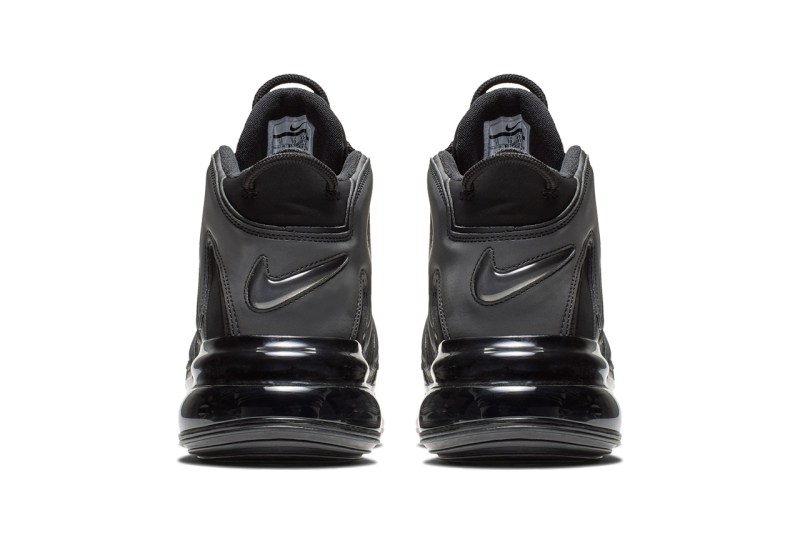 这双鞋以 “大 Air” 系列为设计版本,整体采用纯黑配色,鞋底搭载 Air Max 720 超大可视气垫。对比 Air More Uptempo 系列,鞋身将原本外侧气泡式 AIR 字样换为 MAX 字样装饰,以略带光泽的皮革打造,从鞋头一直延伸至后跟,夸张又复古。