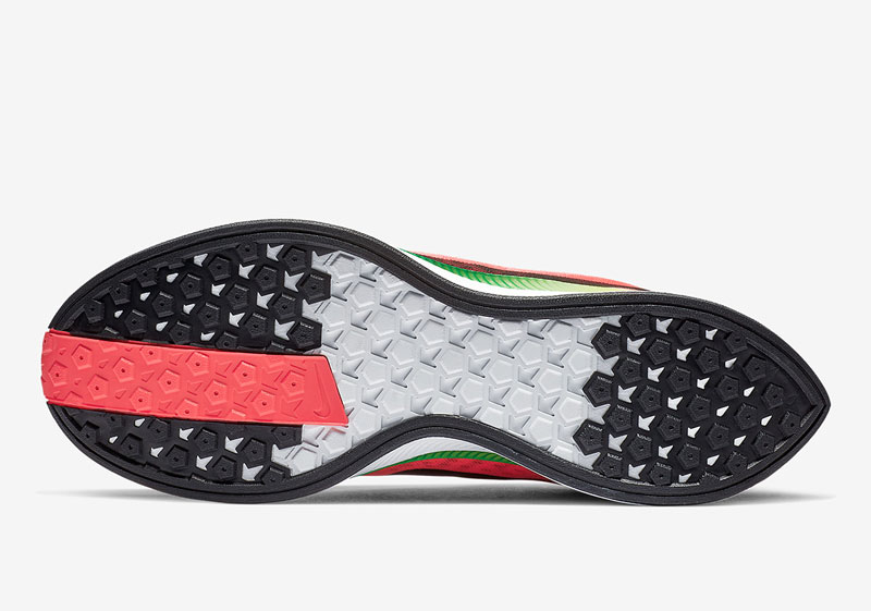整双鞋以红色为基调,黄色与绿色加以点缀,营造出一种葡萄牙旗帜的色调。前掌的条纹对比色调,使其中底的渐变图案为整双鞋增添了不少吸睛度。