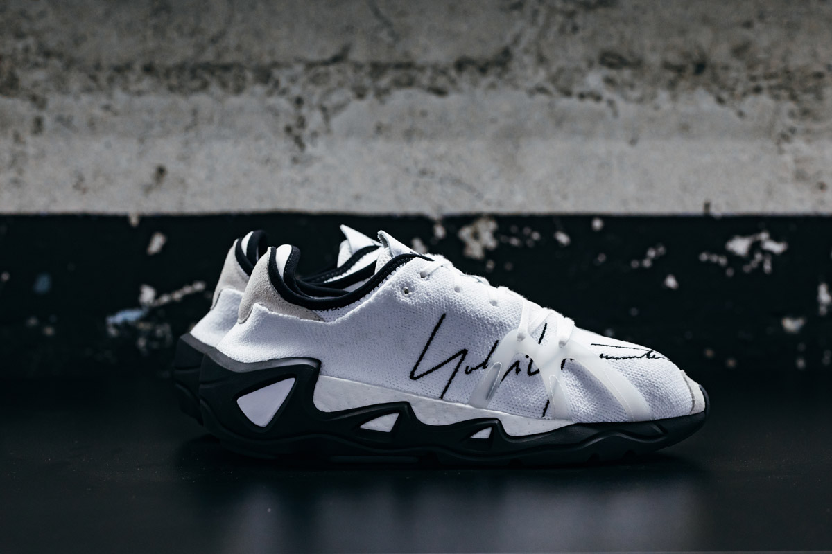 Y-3 FYW S-97 的设计十分简洁,复古波纹外底内嵌 Boost 气垫,针织材质鞋面上附有山本耀司签名 Logo。锯齿状鞋带扣与鞋面麂皮贴布相呼应,质感极佳。