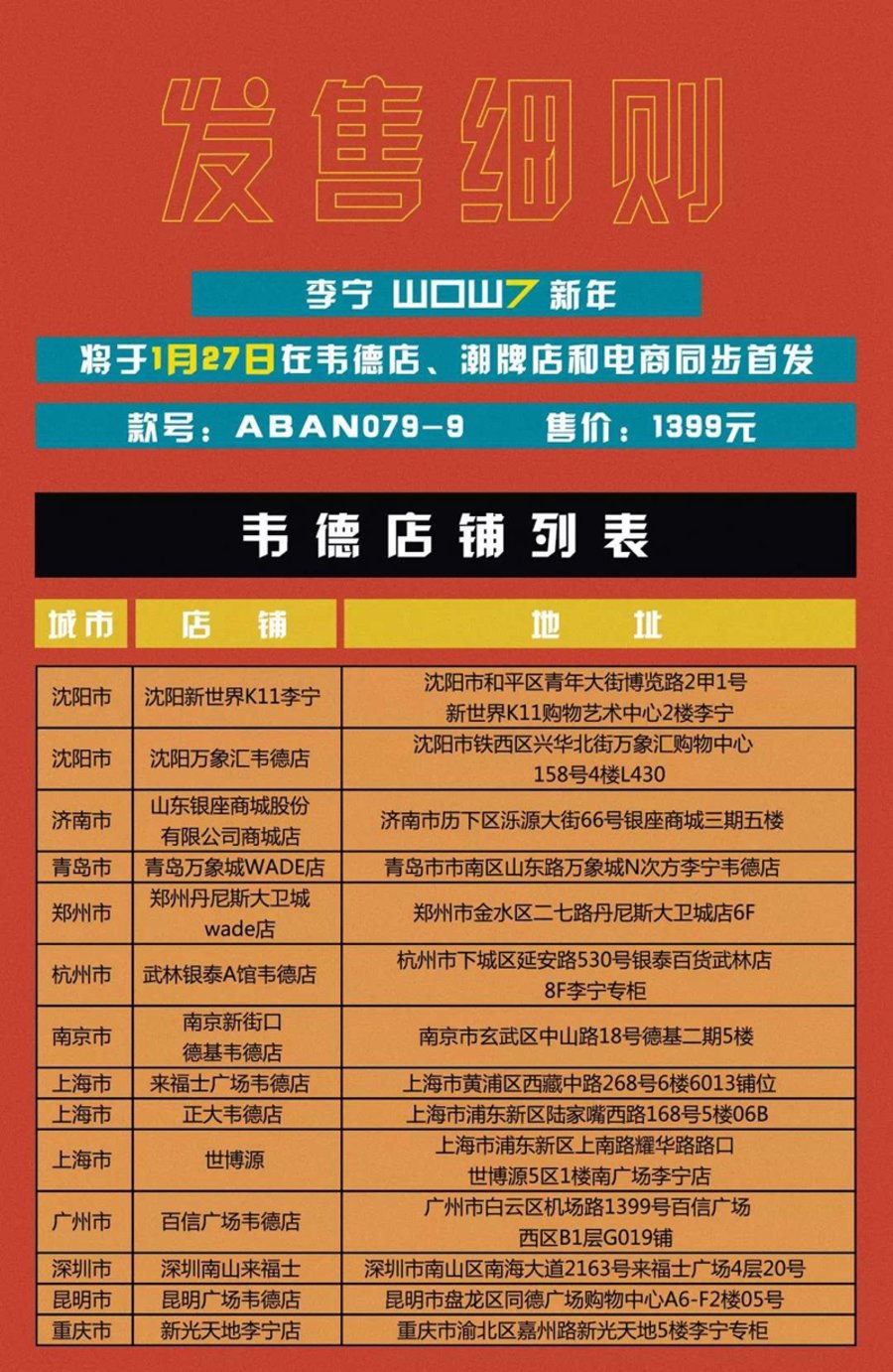 本次李宁 WOW7 新年配色在 1 月 27 日也就是明天正式登陆李宁官方旗舰店、线下门店及 Yohobuy,货号 ABAN079-9,定价为 ¥1399 RMB!这次还将有相同主题的新年卫衣同步发售!