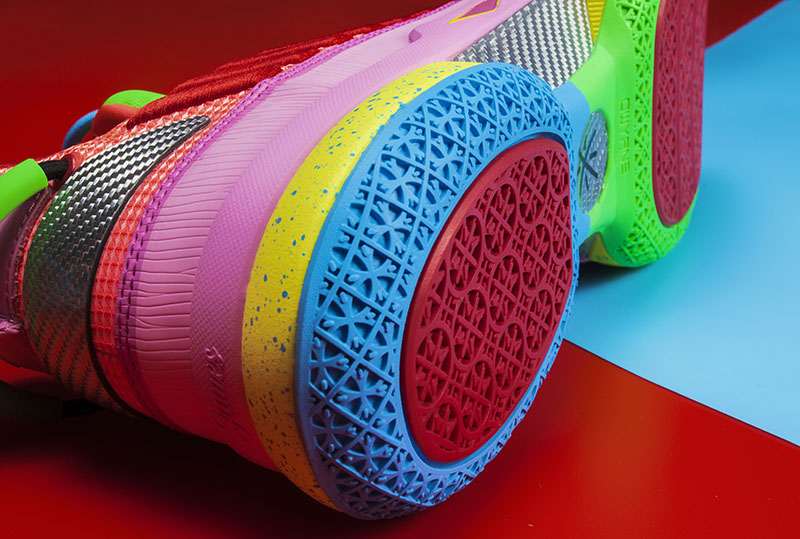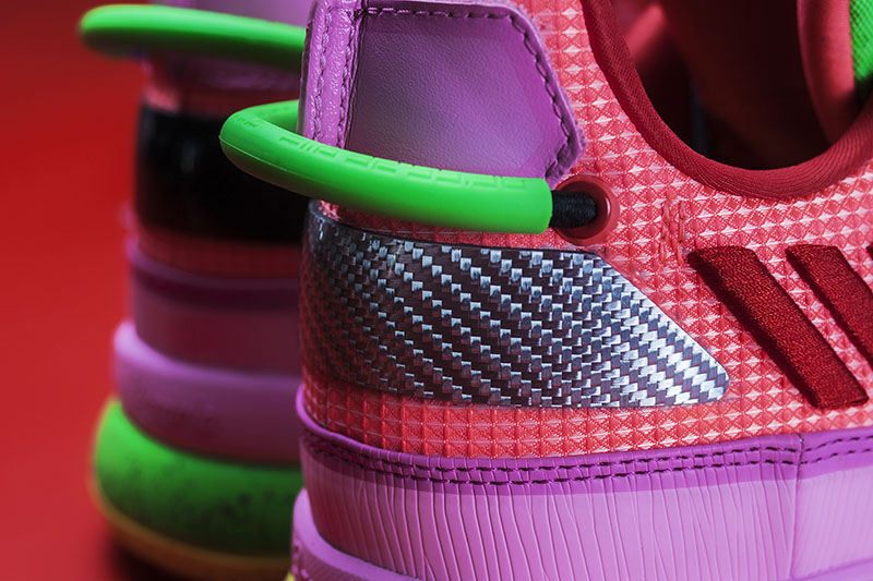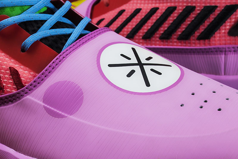 看似同样花哨的两只鞋其实有多处不对称的鸳鸯设计。从鞋带、鞋舌、Logo 到鞋底,双脚的不同色彩变幻让人眼花缭乱。