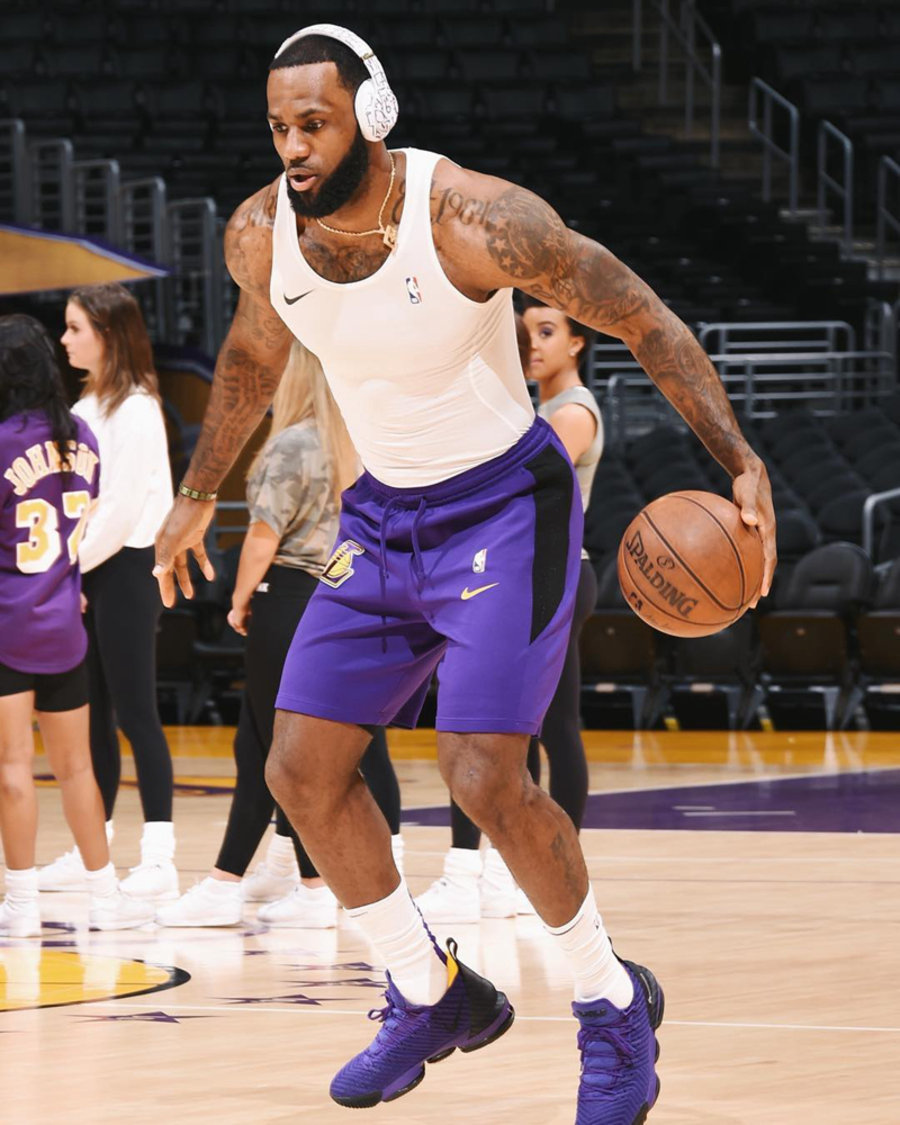 LeBron 16 虽然已经推出了不少配色,但粉丝们最期待的还是紫金装扮。今天詹姆斯在训练中就上脚了一款全新紫色 LeBron 16,恐怕很多詹密都已经不淡定了。