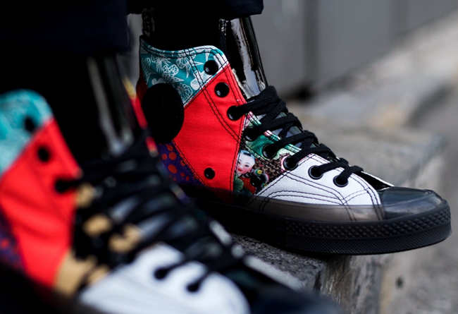不单单是以 “百家衣” 为灵感,还融入了豪狗、天津喷、风筝等历年来经典的生肖元素,半透明的外底,漆皮鞋舌,均致敬去年多双热门 Converse 设计,相比其他百家衣鞋款都更具看点。