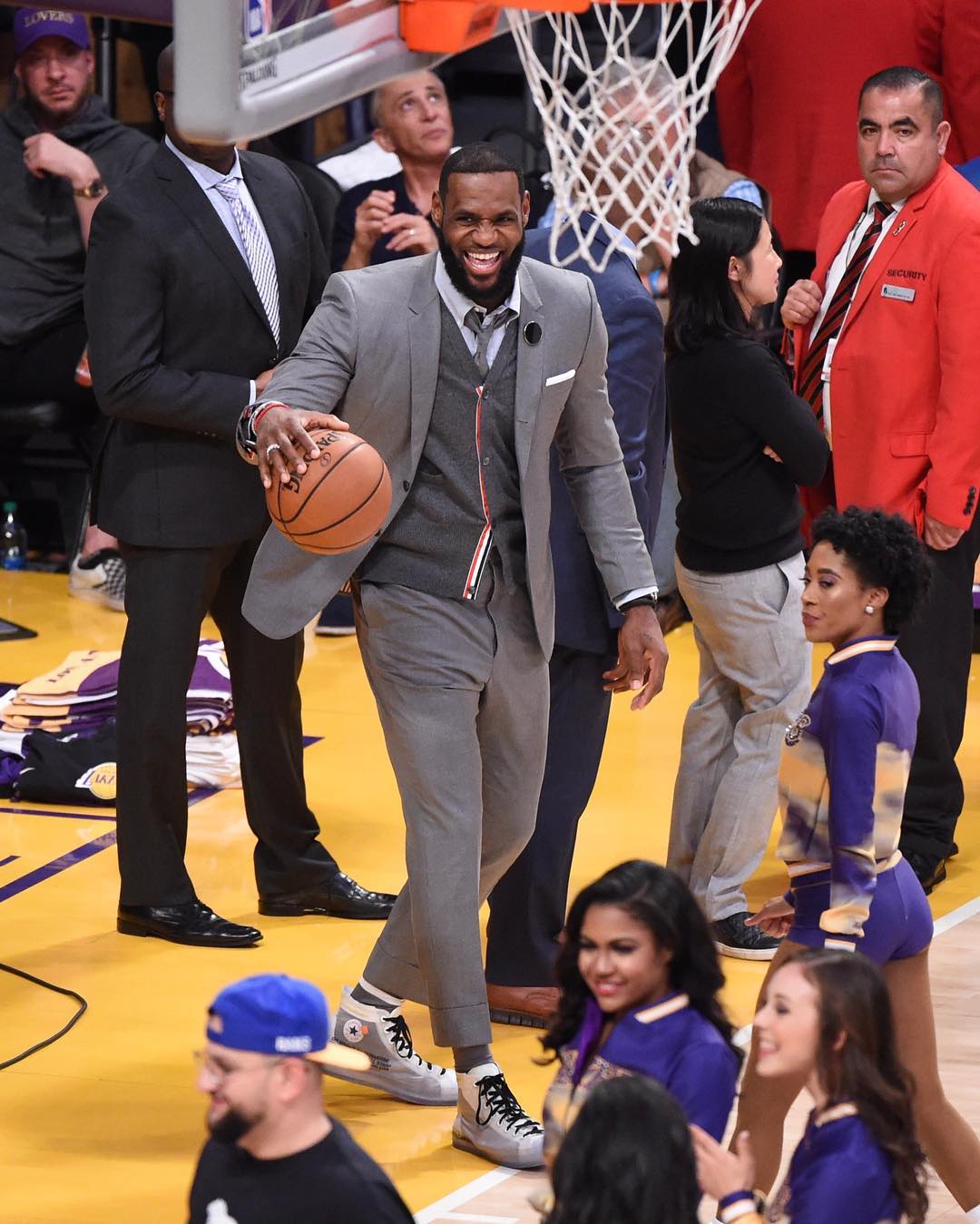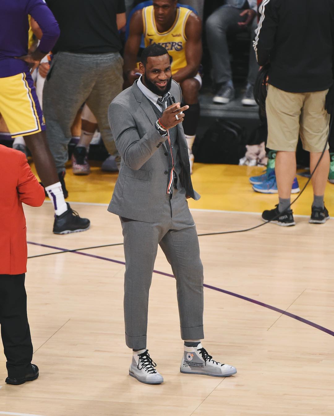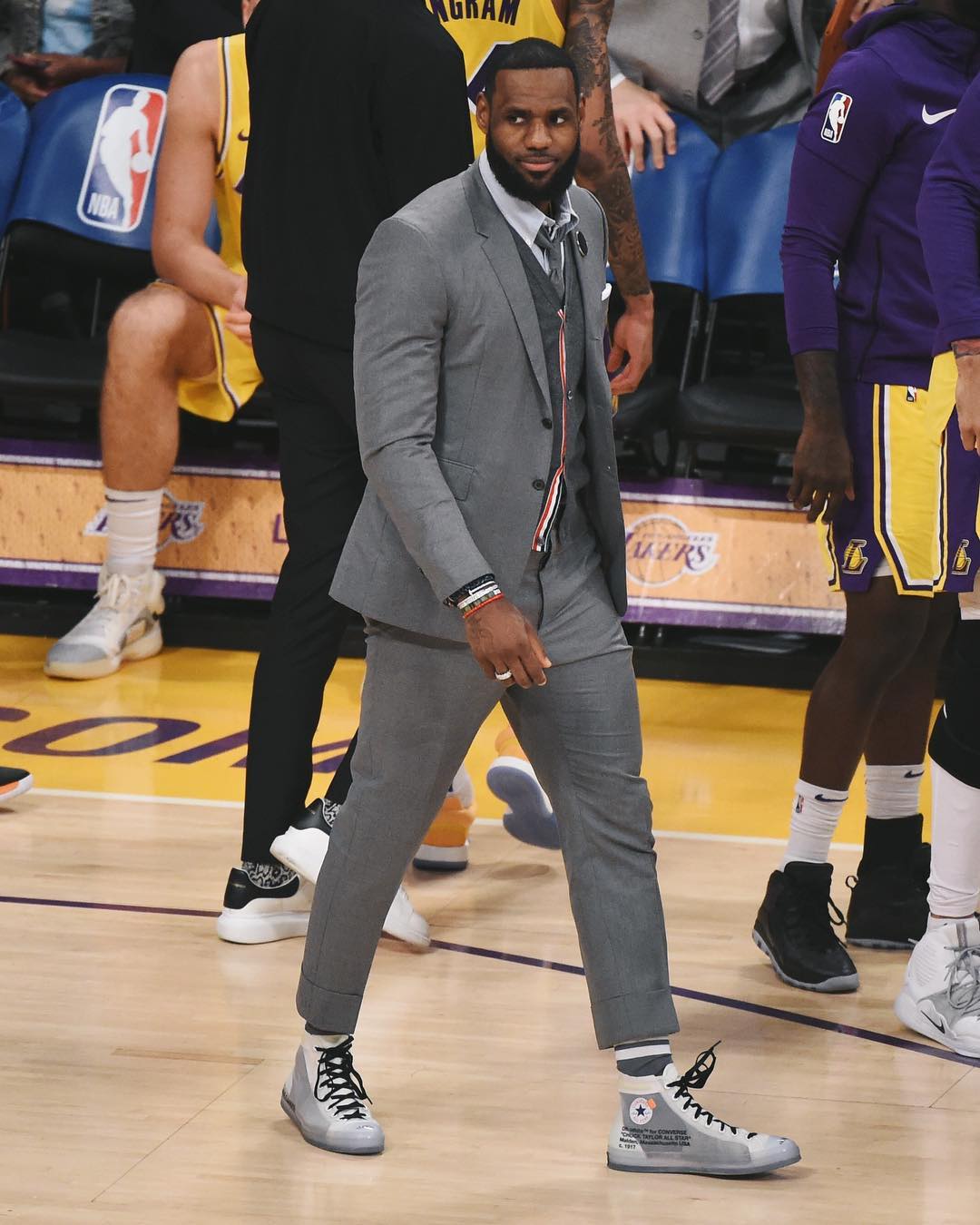 湖人队大当家詹姆斯因伤缺战 76 人 的比赛,坐在场边观赛的他脚下便穿了一双 OFF-WHITE x Converse Chuck 70 搭配灰色西装。