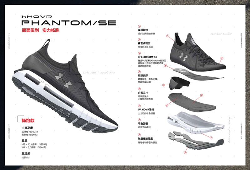 UA HOVR Phantom SE:UA HOVR Phantom 的运动版本,拥有更强的透气性,以及更加符合解剖学的鞋领构造。
