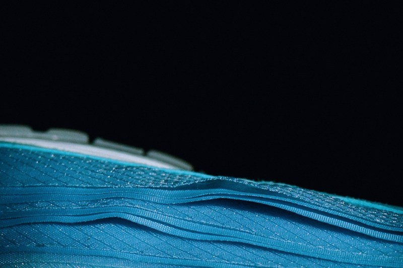 由概念转化的鞋面设计,茹秋实把一层层浅蓝色透明蝉翼拼叠,由中底向鞋带周围汇拢,如同云层般绵延。鞋舌及后跟同样层叠着多层白色透明提带,形状如同水花溅起。