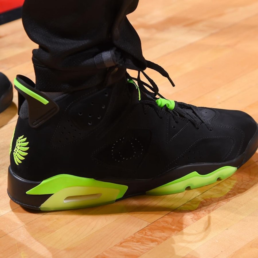 近日,他又晒出一双超限量的 Air Jordan 6 Oregon PE 鞋款。黑色麂皮鞋面,点缀荧光绿色中底、及后跟飞翼等细节,十分抢眼。鞋面更是以透气孔勾勒成俄勒冈 “O” 字标志,可谓非常独特。
