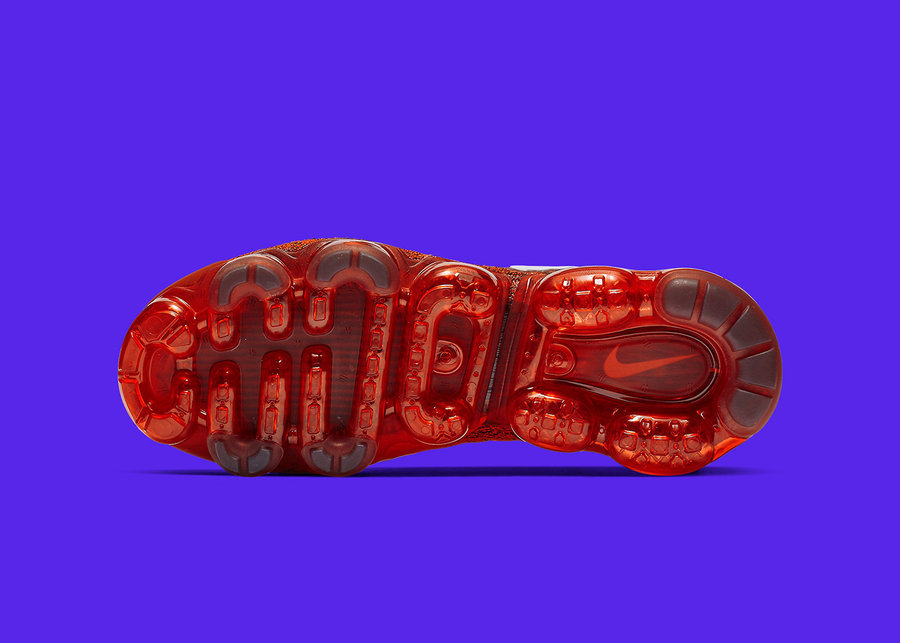 采用了全红的 Flyknit 编织鞋身,搭配全红的气垫大底,同 CLOT x VaporMax 联名配色同出一辙。