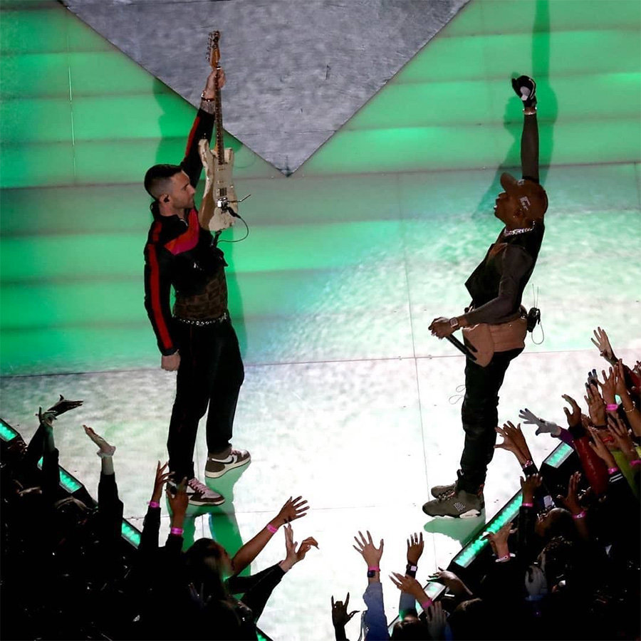 与他同台出演的 Adam Levine 也上脚了一双尚未发售的新鞋,这双反钩的 TS x Air Jordan 1 也是当下球鞋圈关注的焦点。