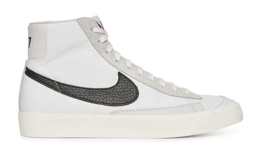 此番选用了近期人气颇高的 Blazer Mid 中磅鞋型为蓝本,采用白色磨砂皮革打造鞋身,Swoosh 则以黑色皮革呈现。
