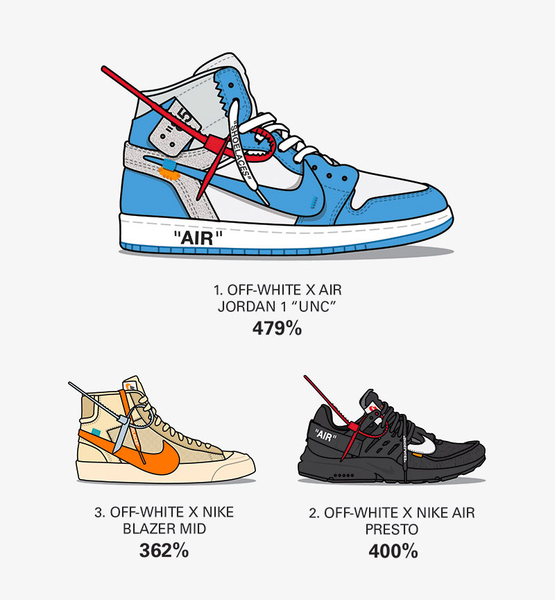 前三名统统是 OFF-WHITE 联名,一方面是因为官方售价并不高,加上爆棚的人气和并不大的货量,导致市场价格不菲,并且一路走高。