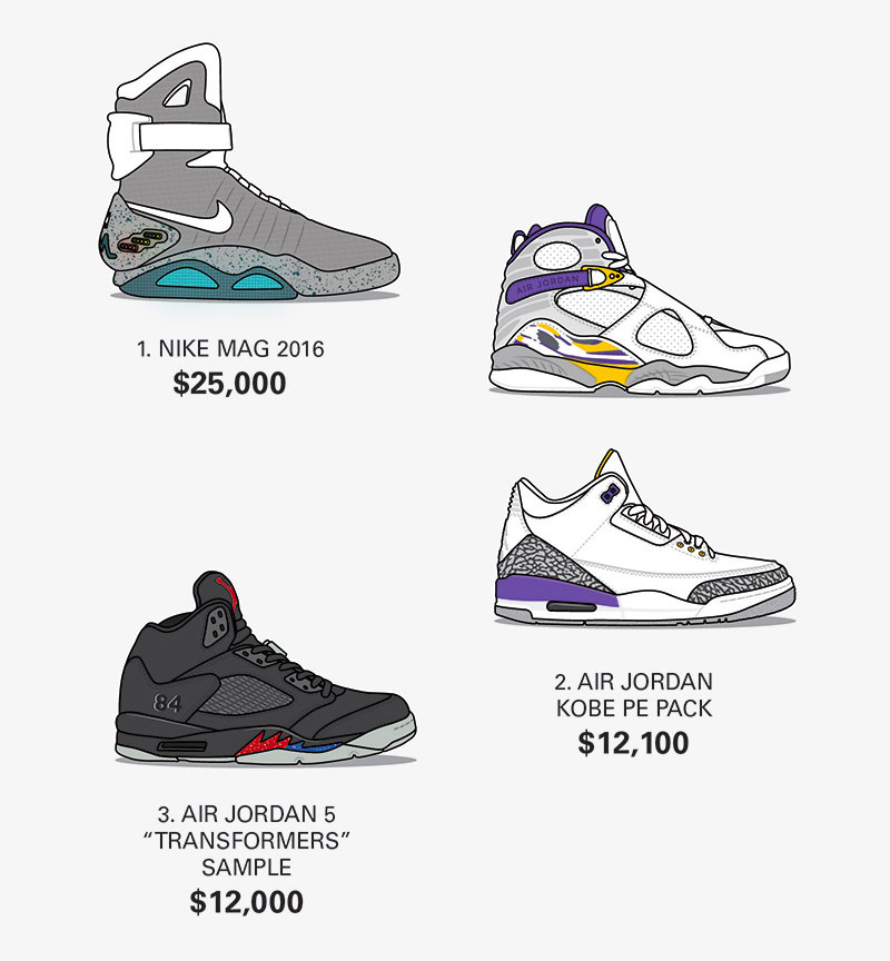 2016 款的 Nike Air Mag 依然是天价鞋中的「帝中帝」,后面是科比的 Air Jordan 3 + 8 套装和 Air Jordan 5 变形金刚 Sample。