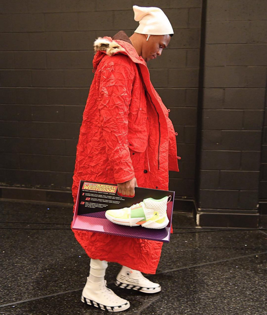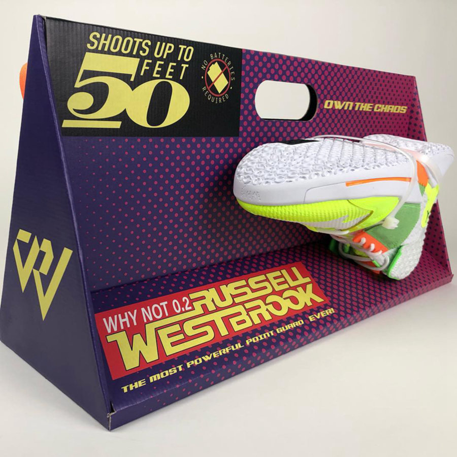 此前威少在球员通道内手提特殊包装版本入场,可以看出将鞋绑扎在纸板上的方式也是有意模仿玩具包装,包装的纸板上还印有 Why Not Zer0.2 的介绍文字。