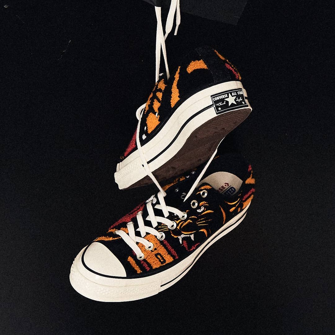 这双 Chuck 70 Low 用全鞋面刺绣描绘了一副美式街头涂鸦,以棒球夹克为灵感的摇粒绒,让侧面的虎头栩栩如生。花体 UNDEFEATED Logo 点缀在鞋舌,颇具质感。