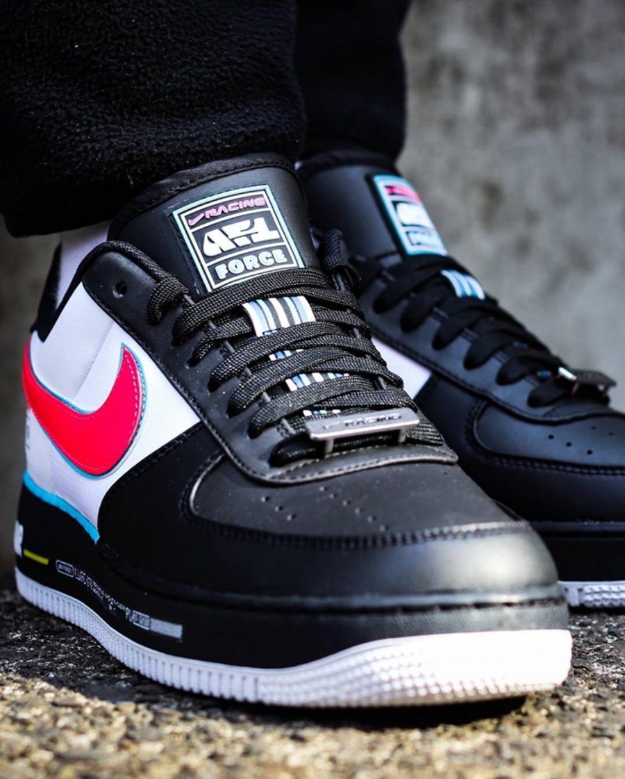 除了配色和印花,鞋带吊牌、鞋头冲孔、鞋舌及后跟 Logo 设计均与常规的 Air Force 1 不同,足见其特殊规格。Swoosh Logo 边缘及贯穿鞋舌、后跟的赛车条纹还带有反光效果,在暗处更加炫酷。