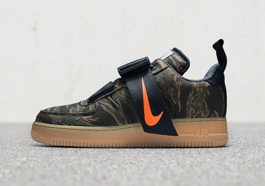 在经典的 Air Force 1 基础上加入绑带设计,增添机能气息。鞋面采用虎纹迷彩,以尼龙布材质打造。绑带上的 Swoosh Logo 以橙色点缀,同鞋舌 Carhartt Logo 相呼应,做工非常细腻。