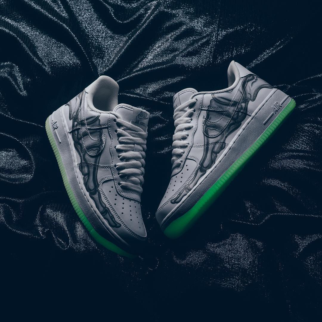 这款万圣节配色 Air Force 1 特别适合夏天的夜行鞋迷,鞋面在最经典的纯白色之上,横贯一条 X 光侧透脚骨骼。外底以荧光材质装饰,在夜晚就如同行走的枯骨,街头创意十足。
