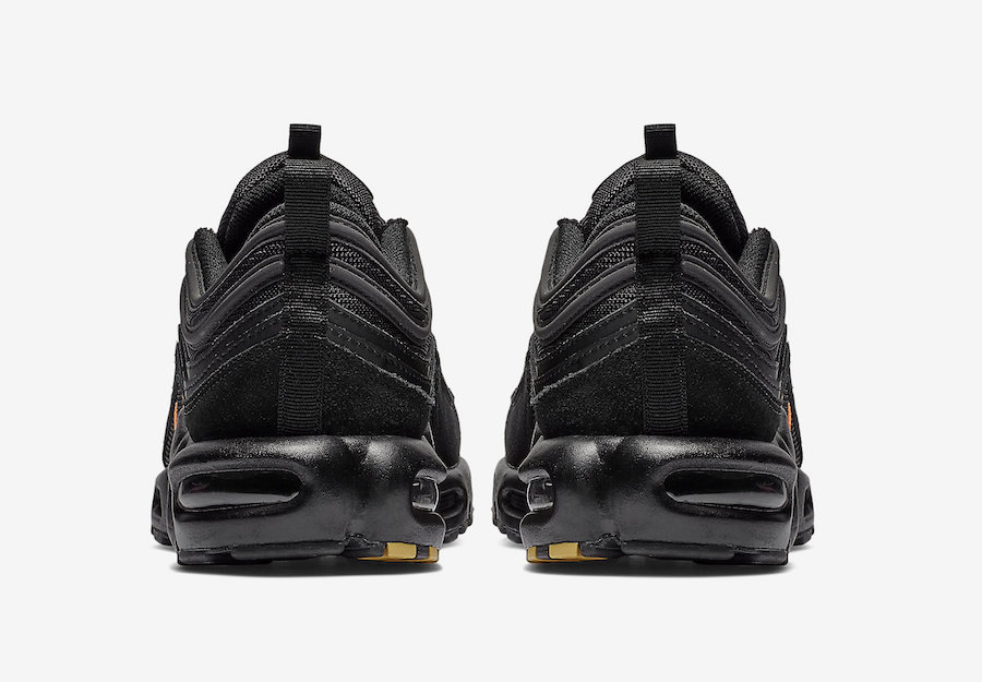 近日,又有一款万圣节配色 Air Max Plus 97 官图释出。这款配色的鞋面为黑色,采用棉绒材质与网布面拼接,鞋身及鞋舌位置 Swoosh Logo 以亮橘色刺绣点缀。