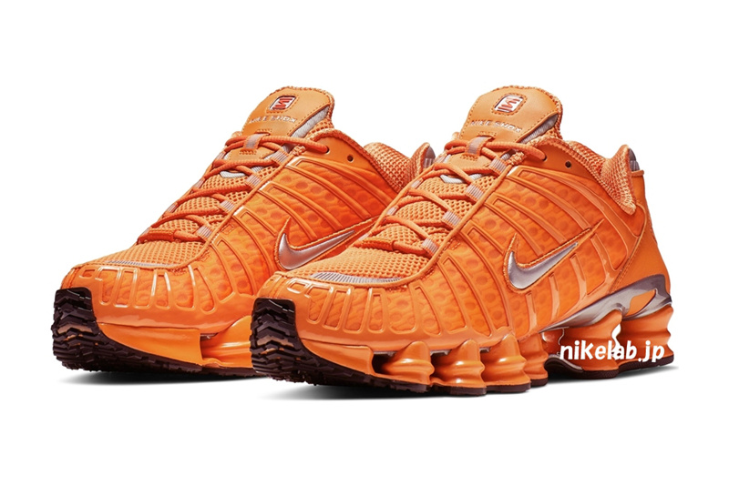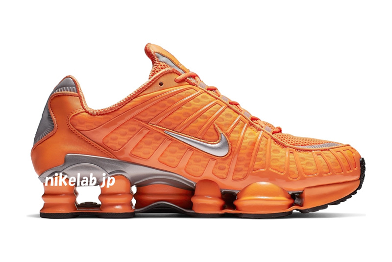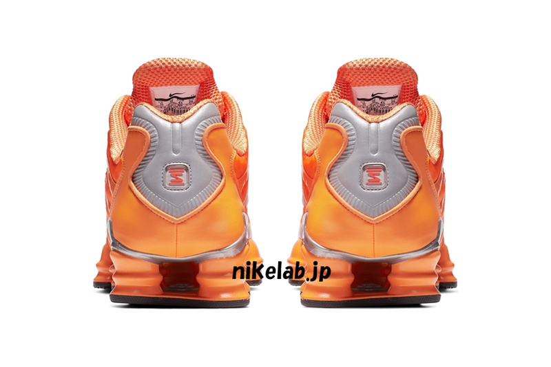 后跟处点缀 3M 反光材质,而标志性的 Shox 气柱同样以橙色妆点,极具视觉冲击力。