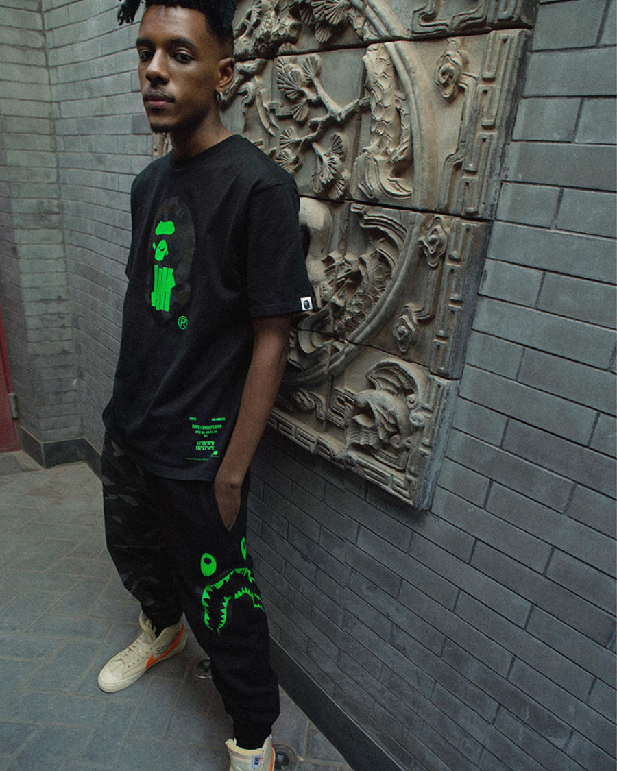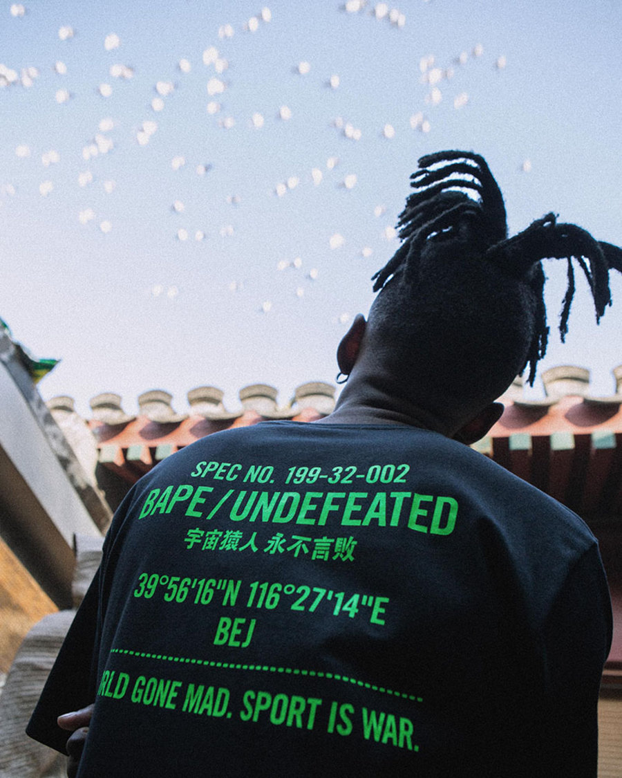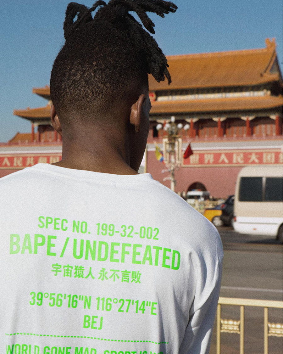 T恤的正面图案将 A BATHING APE® 黑色 COLOR CAMO 猿人头标识及 UNDEFEATED 的标记合二为一,背面更印上字句「宇宙猿人永不言败」,并特别加入北京店铺的坐标,彰显本土特色,极具纪念意义。