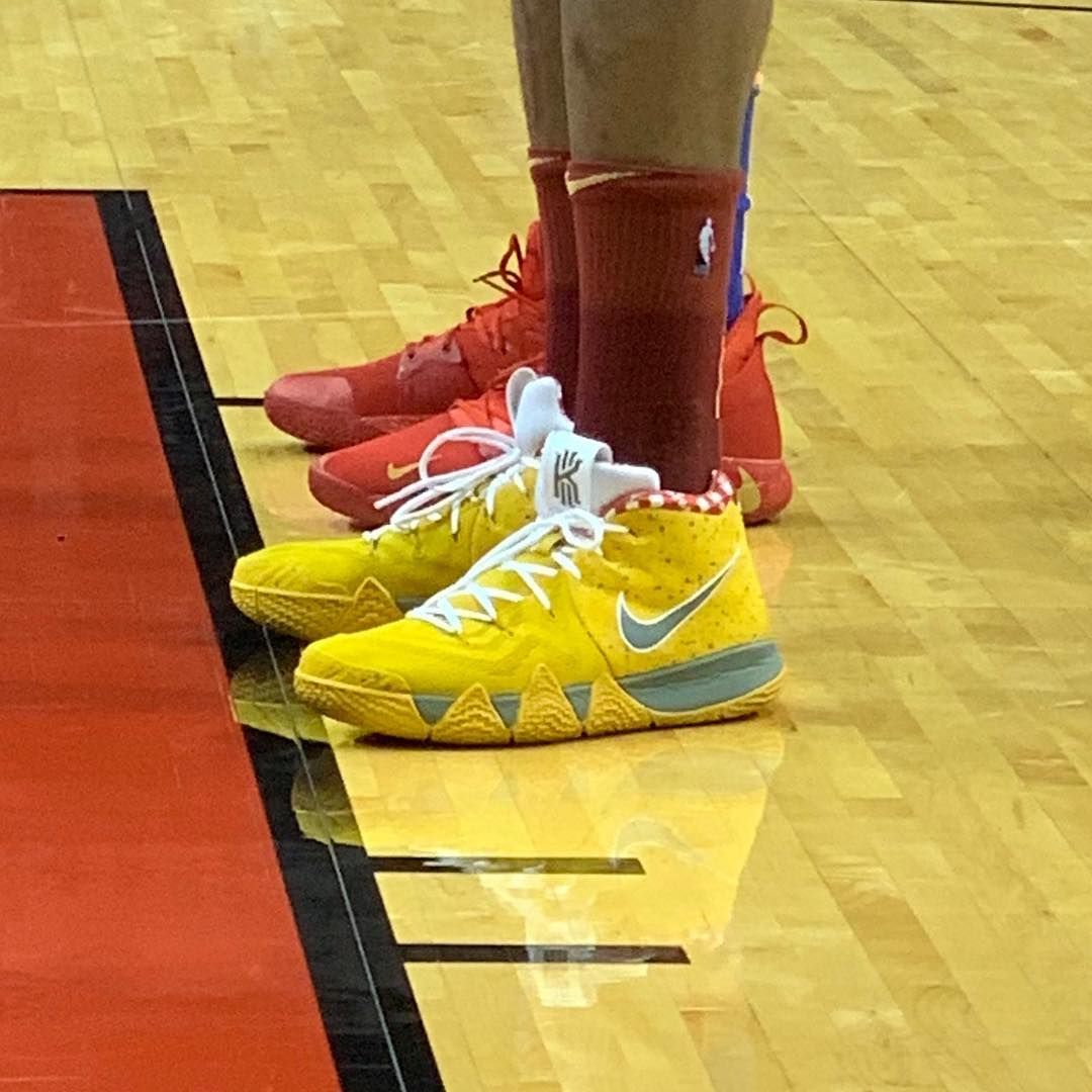 其中就包括今日鞋王 P.J.塔克,在今日火箭对阵独行侠的比赛中,上脚的黄龙虾 Kyrie 4 x Concepts 。