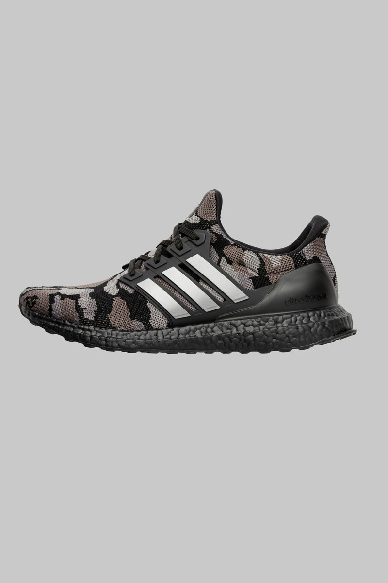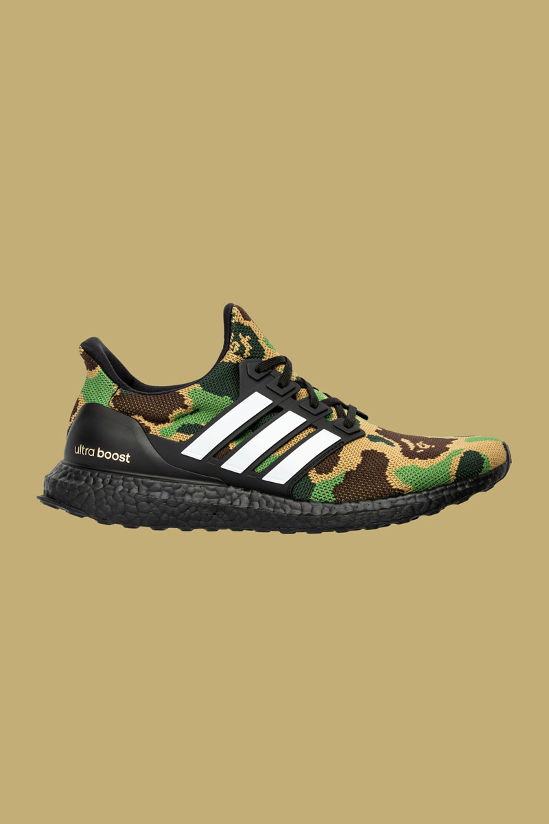 这双鞋不仅有醒目的迷彩鞋面,还搭配黑色的 Boost 中底,鞋舌处的猿人 Logo 以美国国旗填充,后跟点金 “Ultra boost” 字样,尽显与众不同。此次联名可谓十分走心,看来 BAPE 粉丝的钱包又要不保了。
