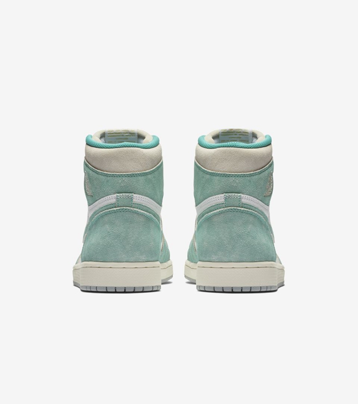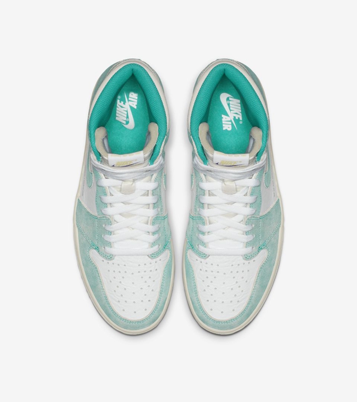 以非常清爽的白色搭配湖水绿示人,鞋身采用皮革与翻毛皮打造,凸显轻松淡雅之余,又有不俗的质感表现。细节之处,除了鞋面 “SP 19 Air Jordan 1 High OG” 印字外,鞋舌处紫金装扮的 “Nike Air” 字样也同样抢眼。