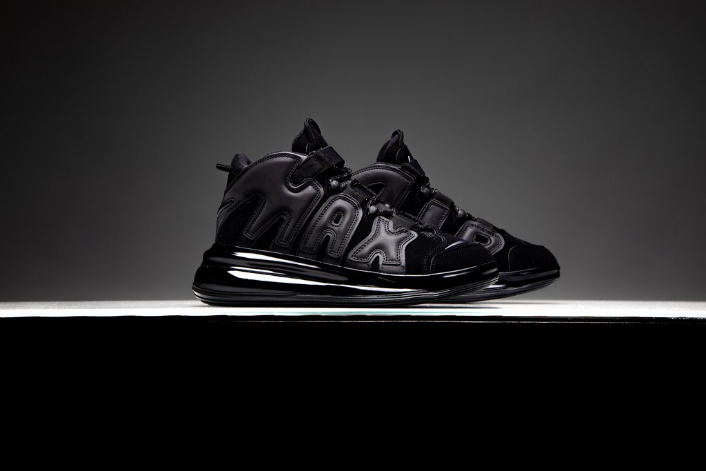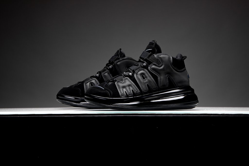 这双鞋以 “大 Air” 系列为设计版本,整体采用纯黑配色,鞋底搭载 Air Max 720 超大可视气垫。对比 Air More Uptempo 系列,鞋身将原本外侧气泡式 AIR 字样换为 MAX 字样装饰,以略带光泽的皮革打造,从鞋头一直延伸至后跟,夸张又复古。