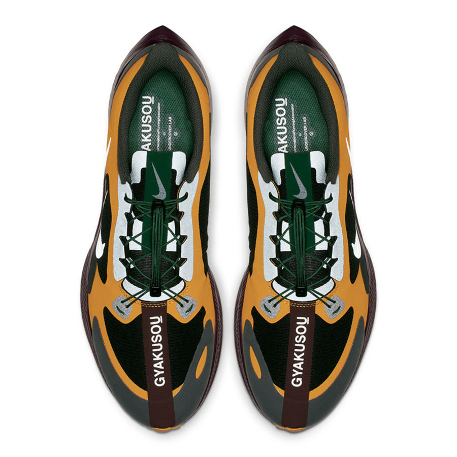 此次联名以酒红色、黄色、绿色为主调,色彩鲜明的同时相当耐脏实用。Vaporfly 4% Flyknit 以酒红色装扮鞋面,中底线条以黄色点缀,领口处以织法呈现 “GYAKUSOU” 字样。