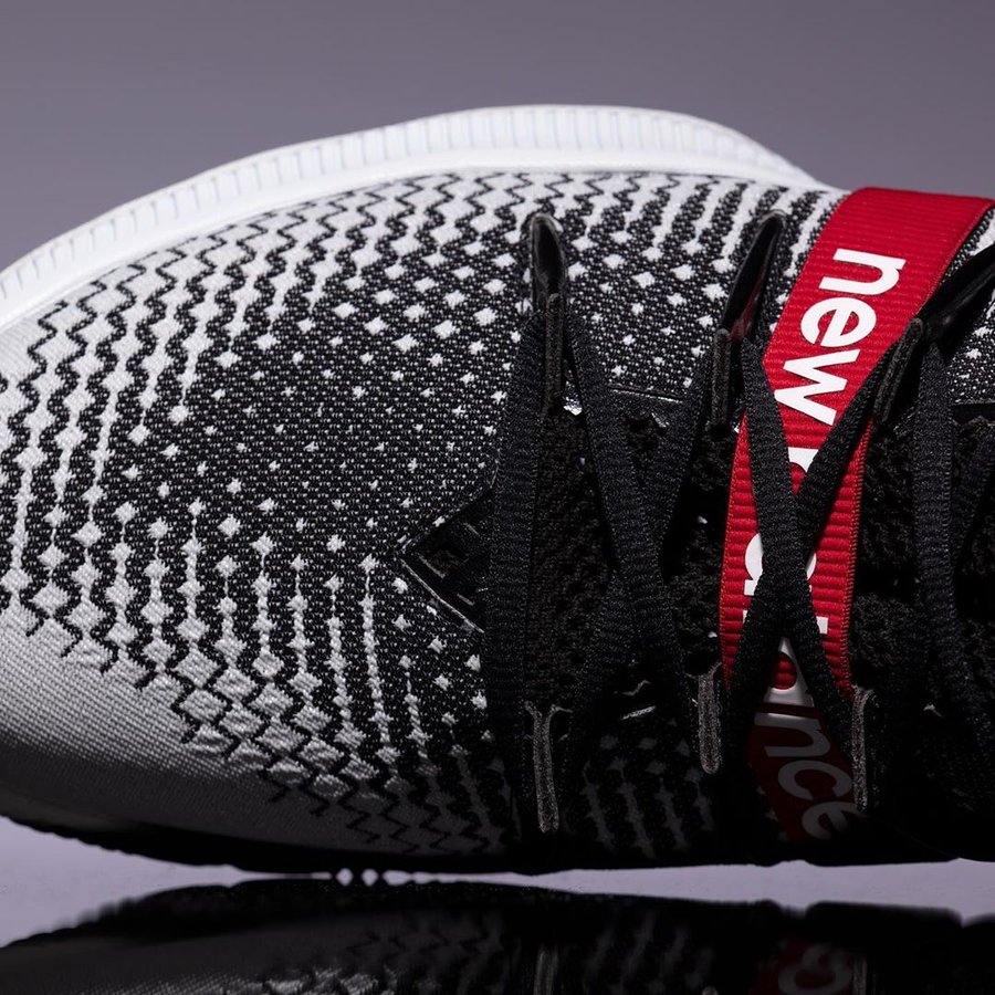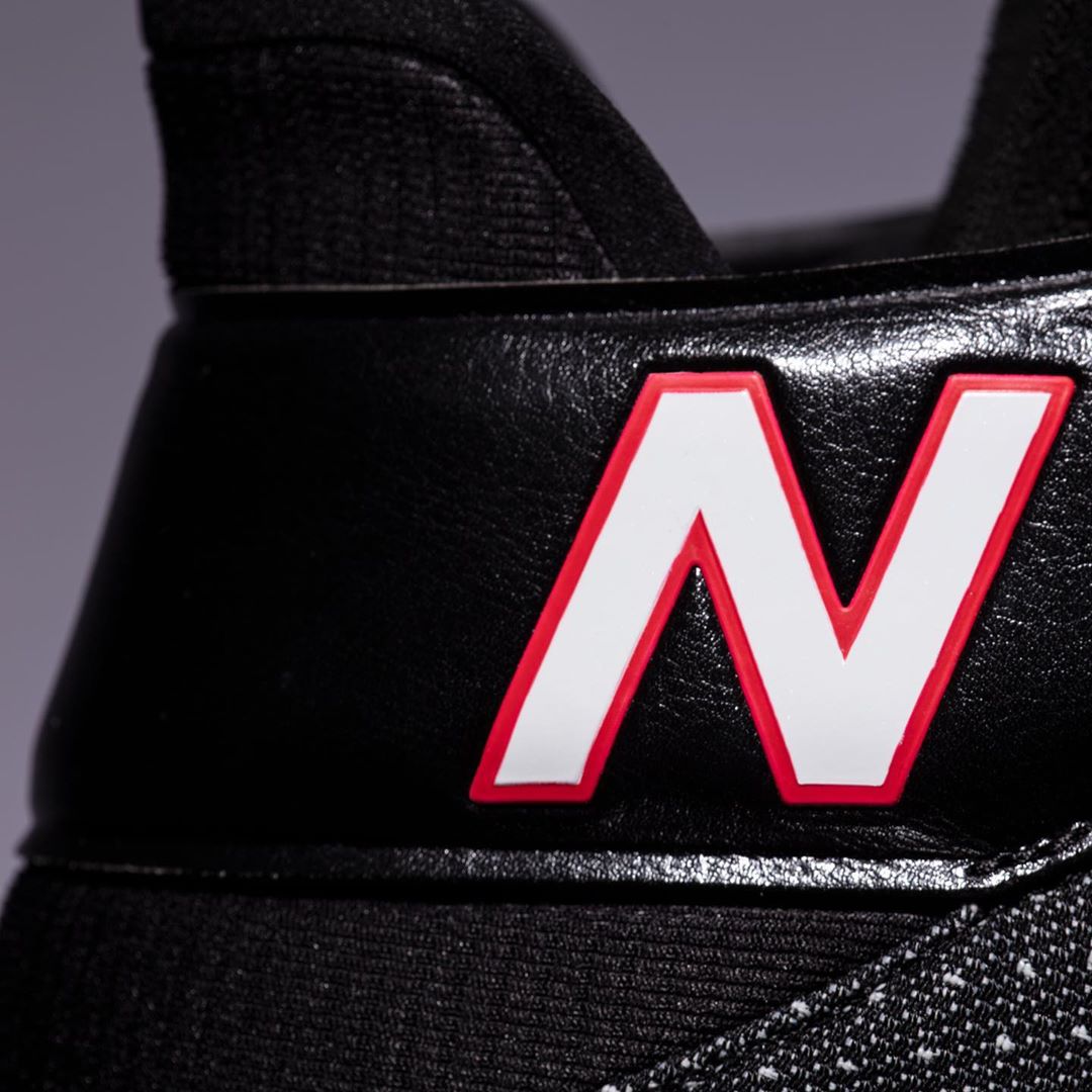 整双鞋以黑白两色为主,鞋面点缀的泡面纹从鞋头延伸至后跟,并在鞋身中部,加入一圈红色绑带点缀,上面印有 New Balance 大 Logo,彰显身份。