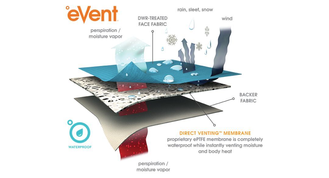 不常见的 eVent 面料,其防水性能其实跟 Gore-Tex 旗鼓相当,但是透气性却比 Gore-Tex 好很多。据说在 30% 湿度的情况下,eVent 的透气性是 Gore-Tex 的两倍。