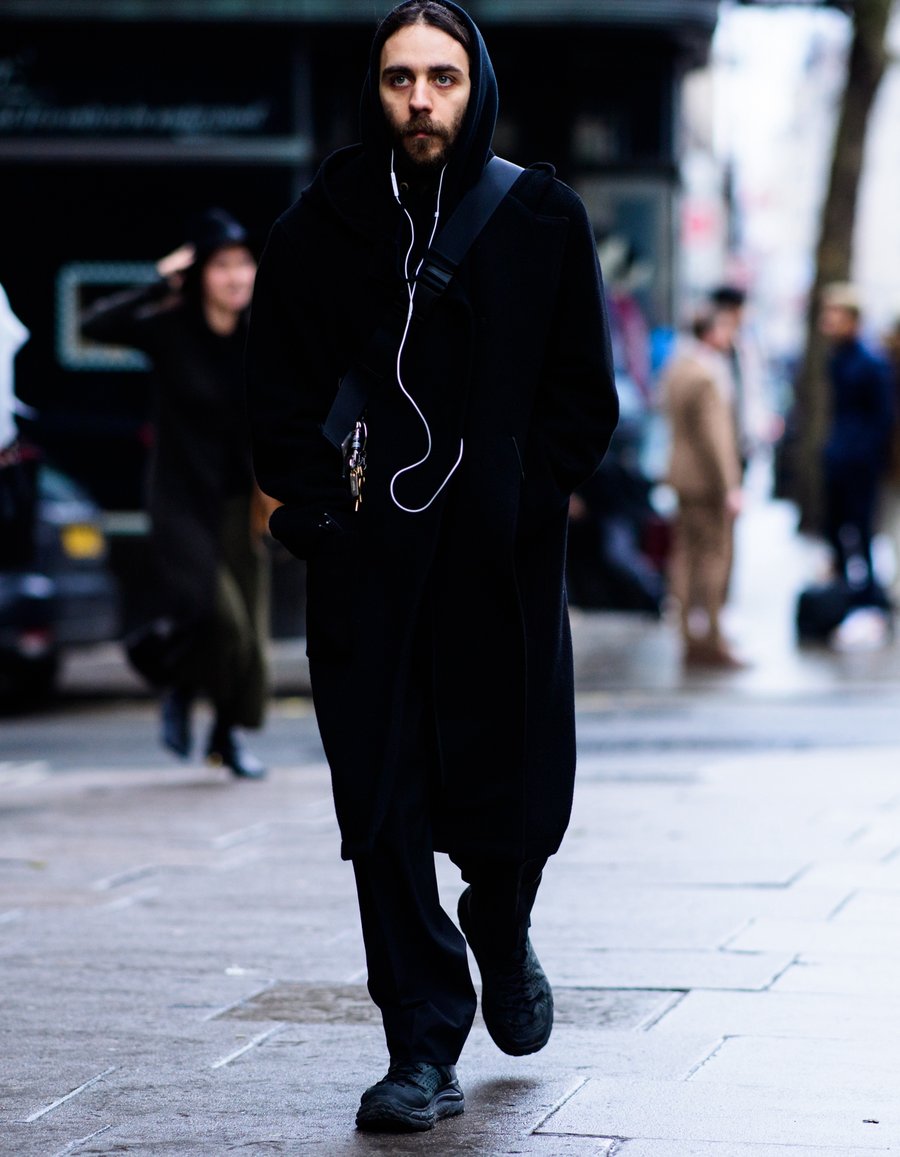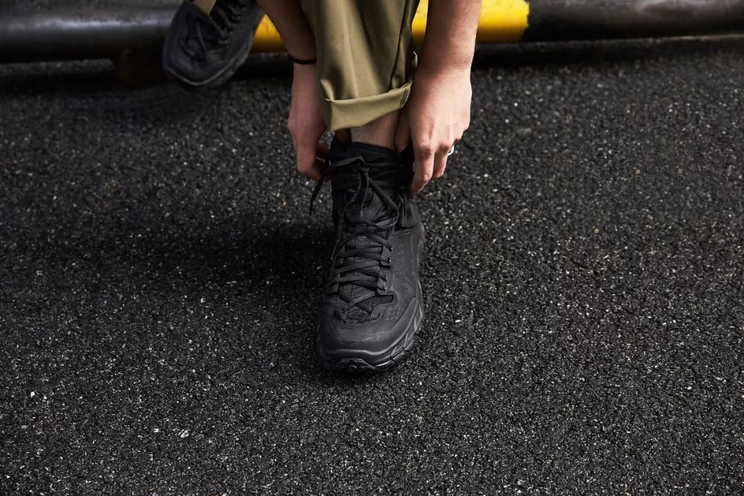 劲酷的黑魂装扮,高帮的军事风格鞋靴感受,细节颇多,既硬朗又精致细腻。