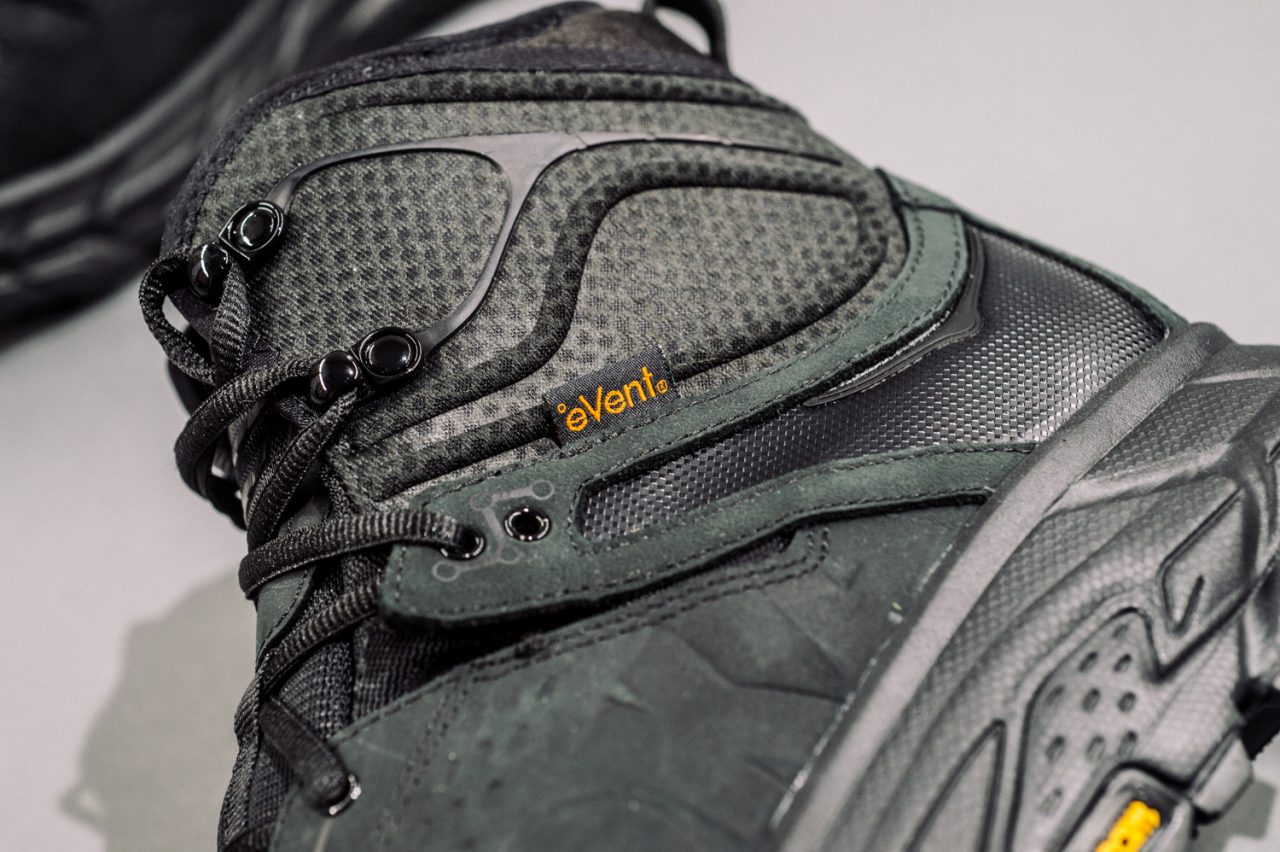 由此而采用 eVent 防水膜结合灰黑色的皮革面料,让鞋面质感更细腻,鞋身更紧凑。