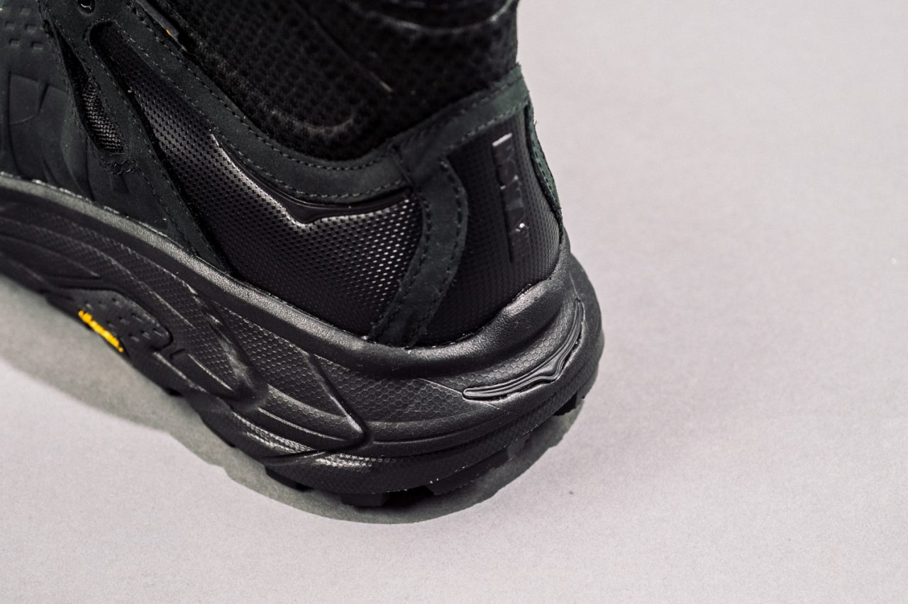这双鞋在前端包裹热加固材质,细腻的纹理上点缀抛光 HOKA 飞翼纹饰。