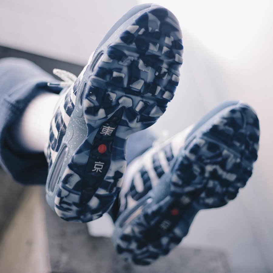 配色方案颇具素雅日系风格,以乳白色打底,鞋头和后跟采用蓝灰色妆点,侧面辅以巨大的 “Just do It” 字样,极具辨识度。中底以溅潵漆方式呈现,玩味十足。鞋舌上富士山图案与大底日本国旗、“东京” 字样,均彰显独特身份。